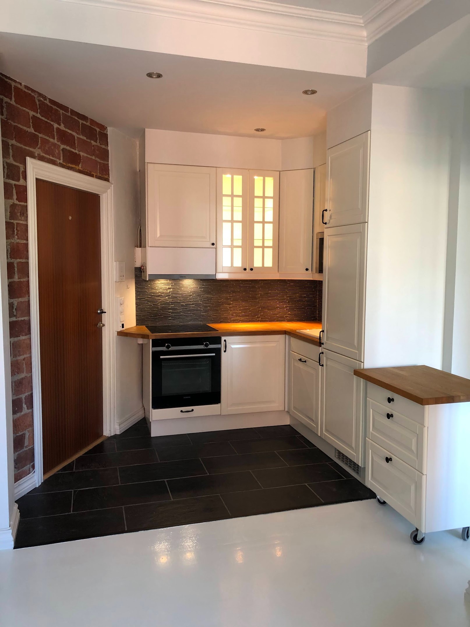Kjøkken/stueløsning, fliser m/varme i kjøkkendel, malt parkett i stuedel. Kjøkken er fra 2012 og inneholder induksjon platetopp, stekeovn, ventilator, mikrobølgeovn, kjøleskap, fryser.