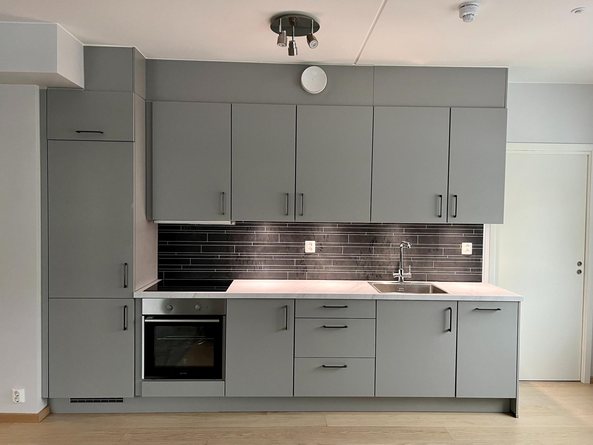 • Kvalitetsinnredning på kjøkken med integrerte hvitevarer: stekeovn med integrert keramisk koketopp, oppvaskmaskin, Kjøkkenvifte, kombinert kjøle- og fryseskap er inkludert.
