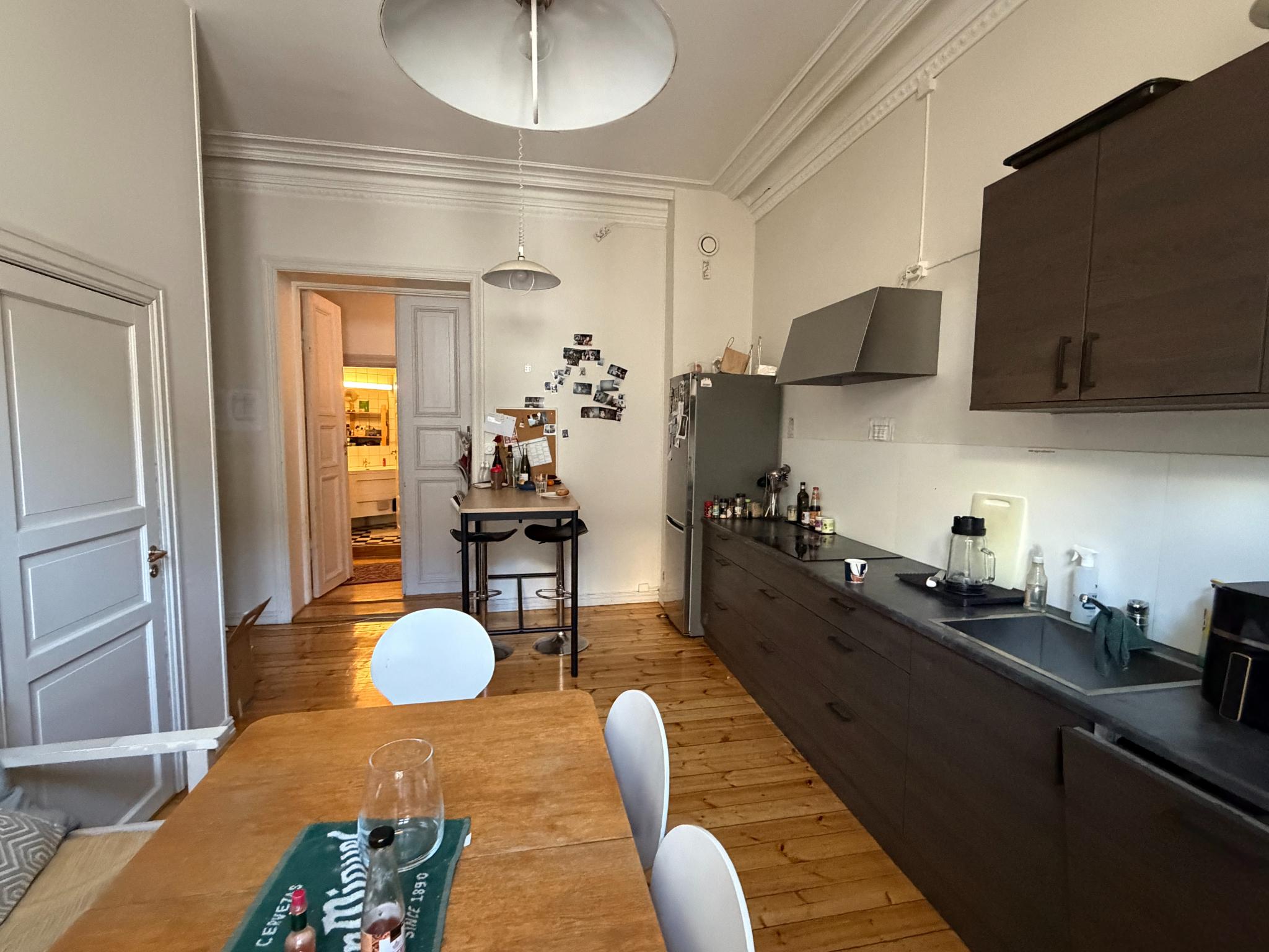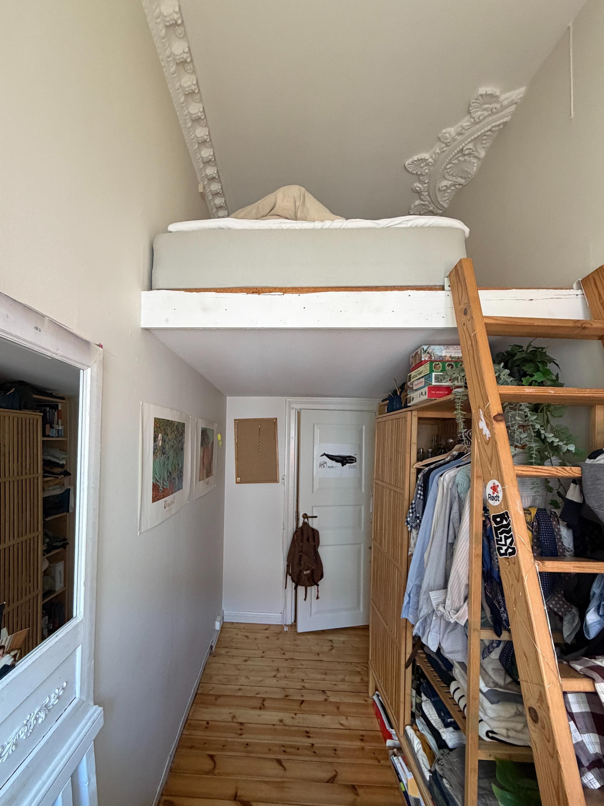 Kollektivet har stort kjøkken og stue, en innebygd balkong og et bad med god størrelse. Rommet som leies ut ligger ved siden av et annet rom, og disse to rommene deler en ekstra gang hvor det er litt ekstra oppbevaringsplass. Rommet har en hems hvor det er plass til 90- eller 120 seng. Jeg har nå en 120-seng der. Kan få opp en 150-seng, men jeg er litt usikker på hvor praktisk det blir mtp. å komme opp/ned stigen.