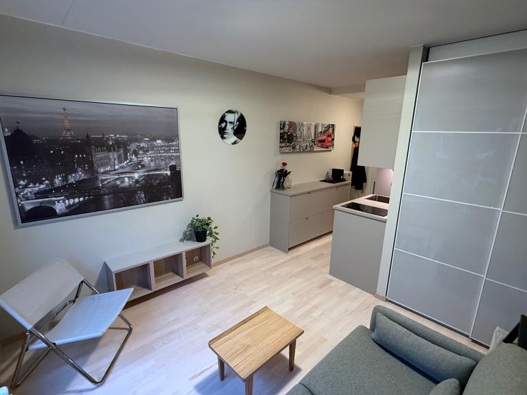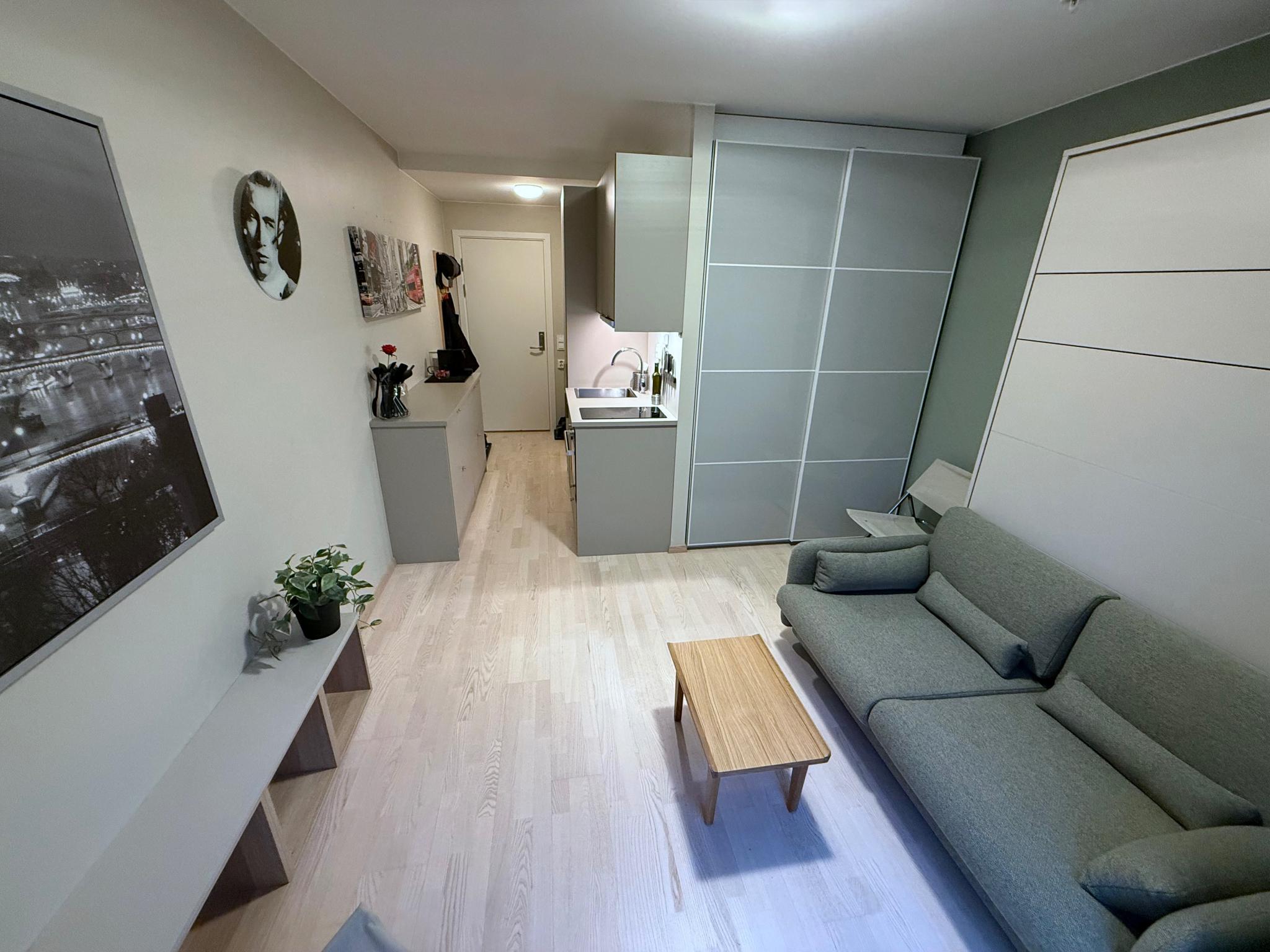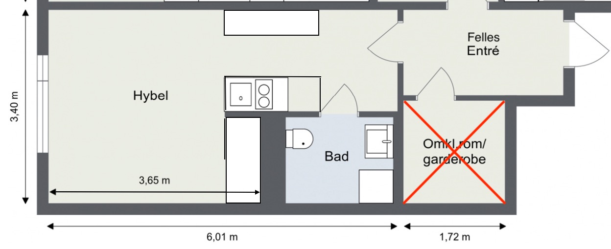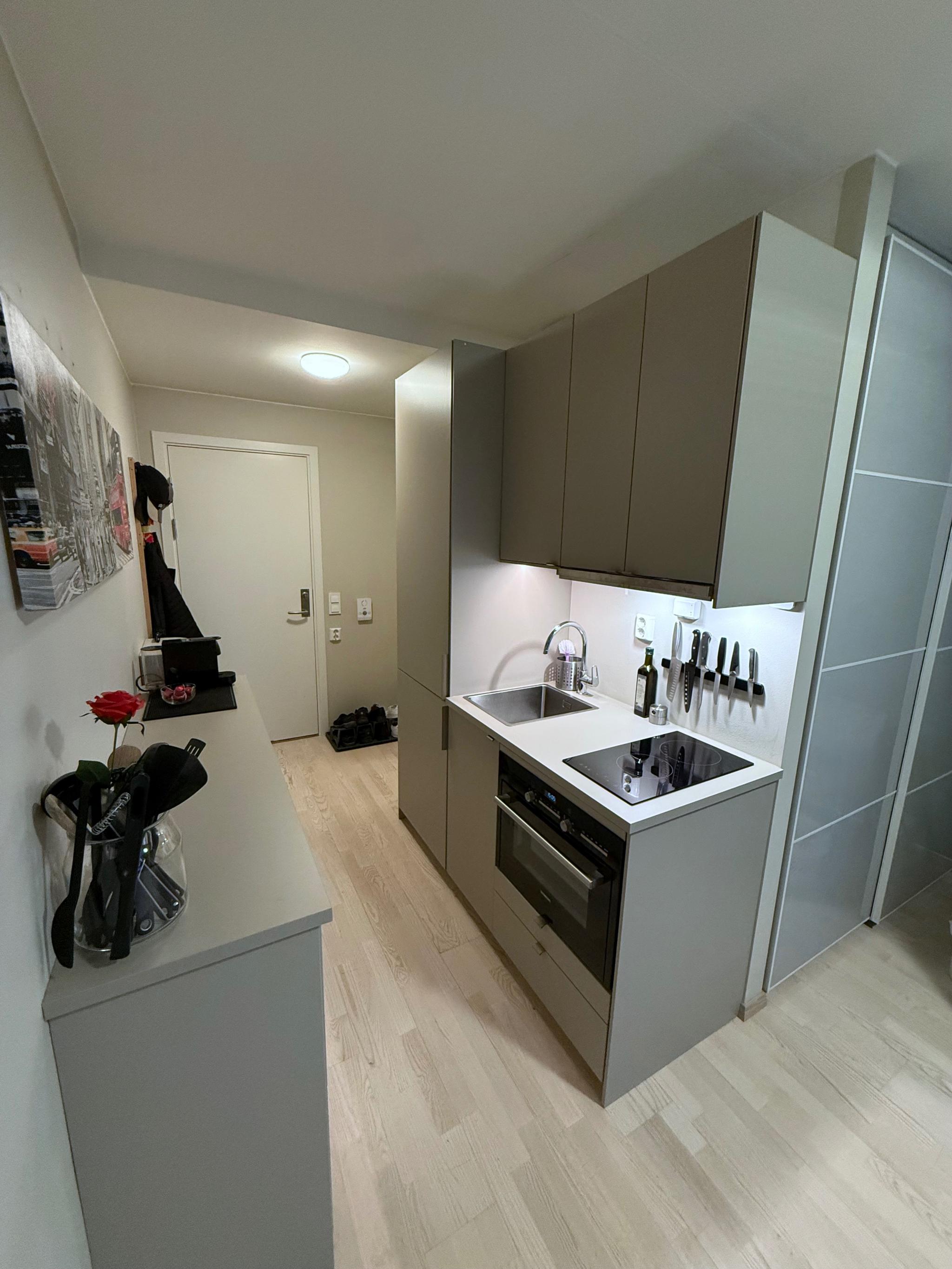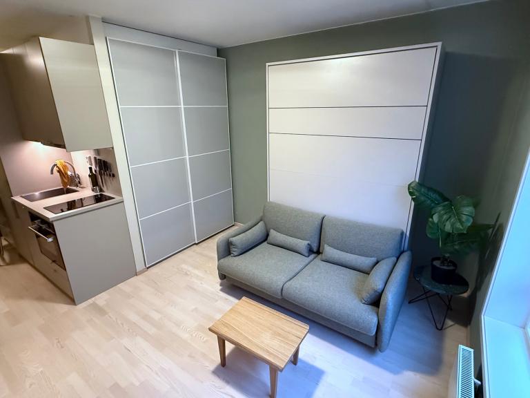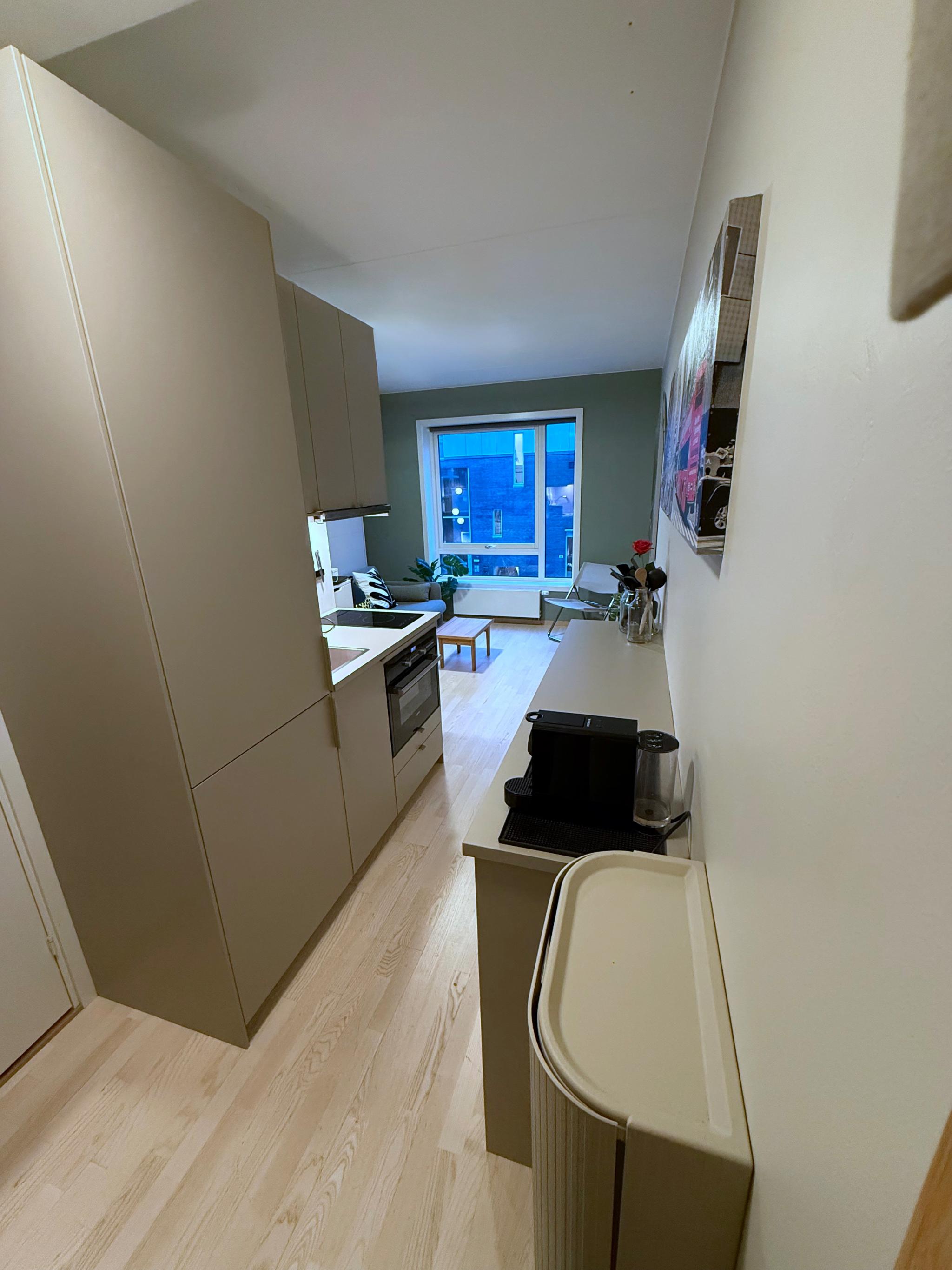 Planløsningen er arealeffektiv med smarte løsninger. Hybelen ble oppgradert høsten 2025 med nytt funksjonelt kjøkken, skapseng og maling av overflater. Kjøkkenet har god lagringsplass og full size kjøl/frys. Skapsengen gjør det enkelt å bytte fra oppholdsrom med sofa til soverom med dobbeltseng. Sengen har ordentlig fjærmadrass og overmadrass. (Si farvel til dårlig søvn på en sovesofa). Stor skyvedørsgarderobe (150 cm).