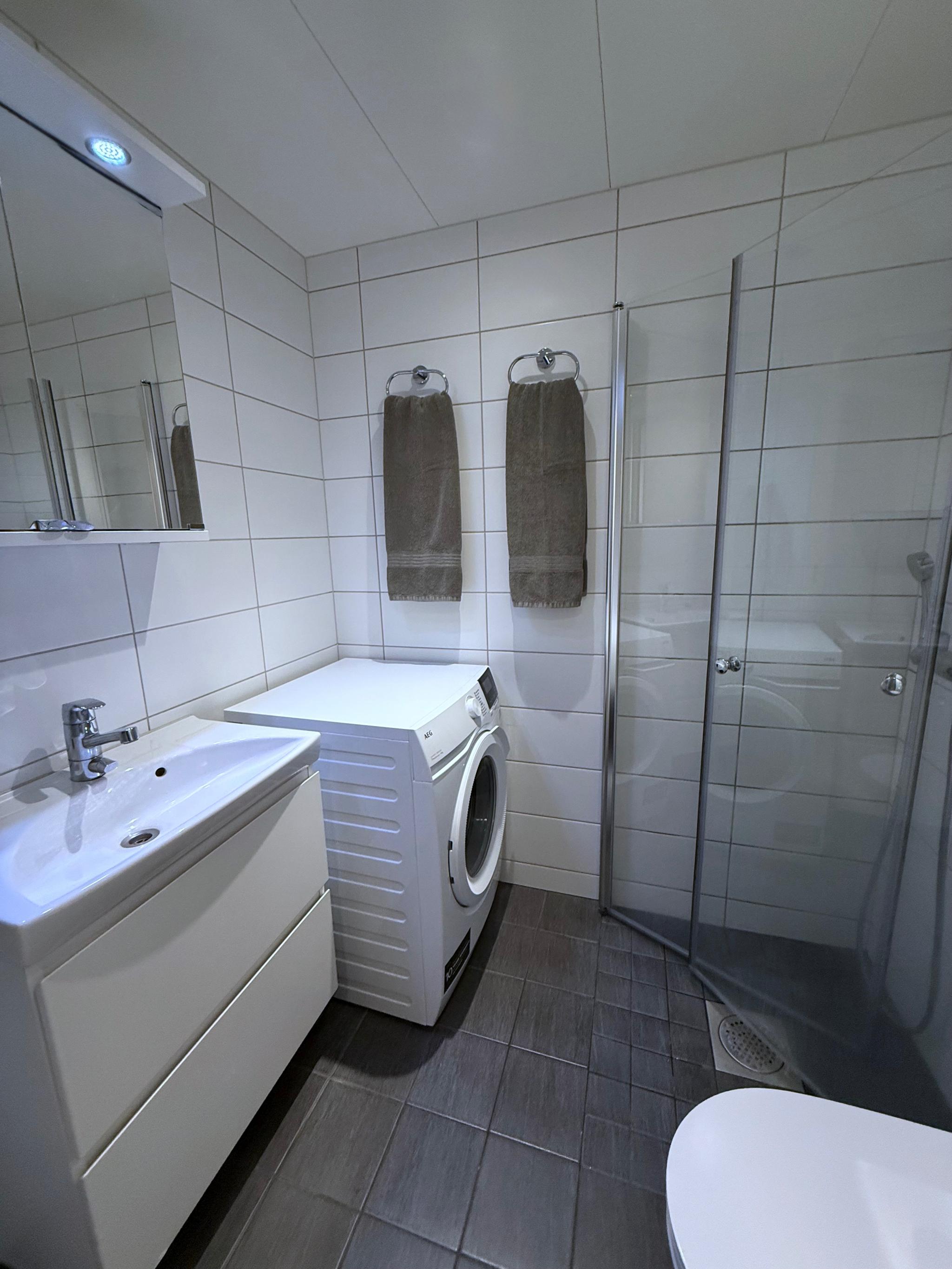 Badet er flislagt med vannbåren gulvvarme og downlights i tak. Vaskemaskin.