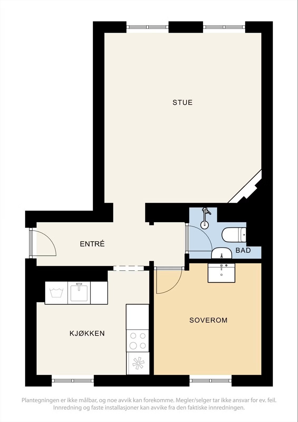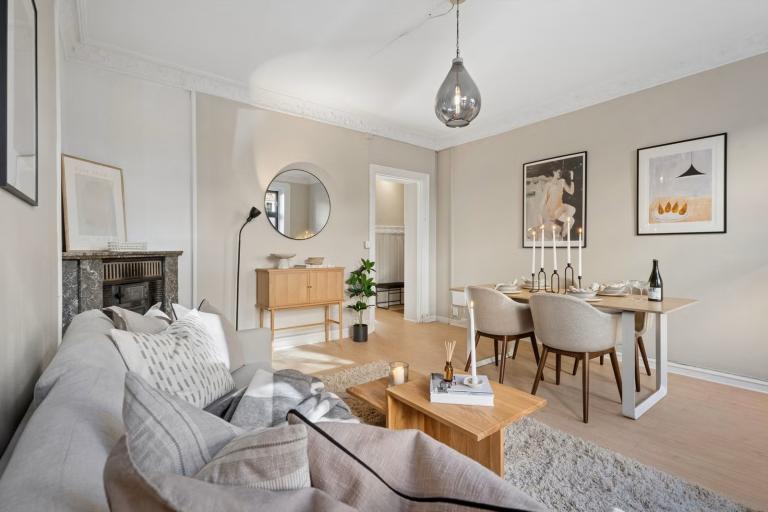 Boligen er en lys og gjennomgående 2-roms leilighet med praktisk planløsning bestående av entré, stue, kjøkken, soverom og bad. Leiligheten har god takhøyde og klassiske detaljer som stukatur, store vindusflater og en hjemmekoselig peisovn.
