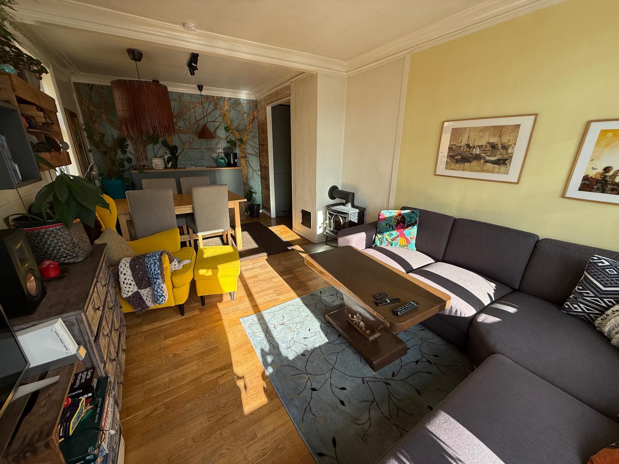 2 soverom, ett med 150seng og ett med høy enkeltseng og kontorpult. Koselig stue med utsikt over byen på kveldssolsiden. Liten peis, tv krok og spisestue. Nytt kjøkken med flotte nye hvitevarer. Ekstra bod i kjelleren.