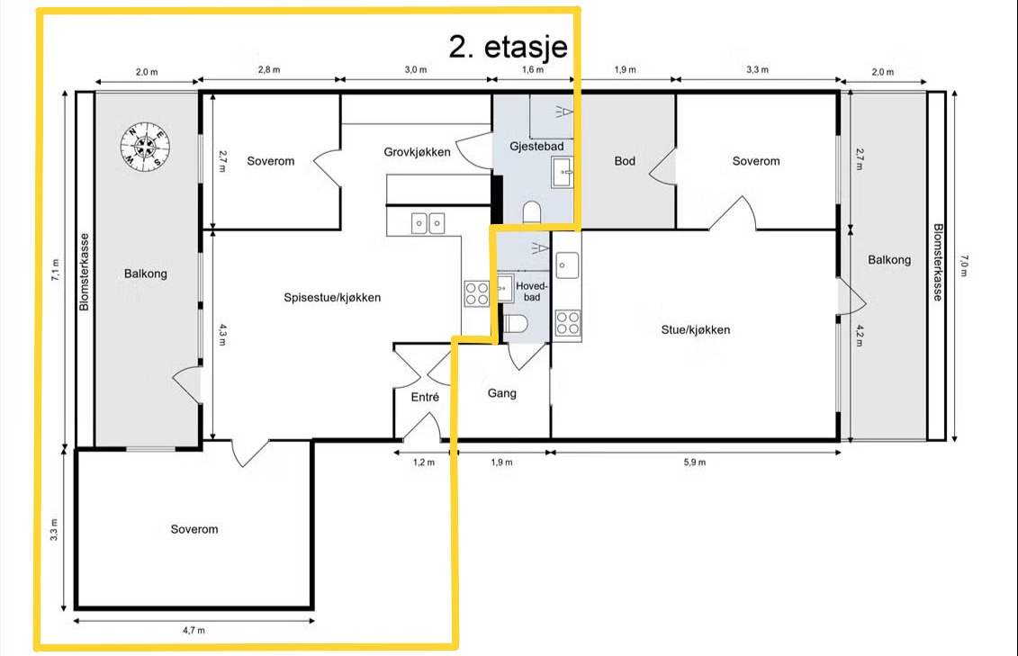 Leiligheten er hoveddelen av en større leilighet med utleiedel. Det er delt opp som man kan se av plantegningen på bildene.