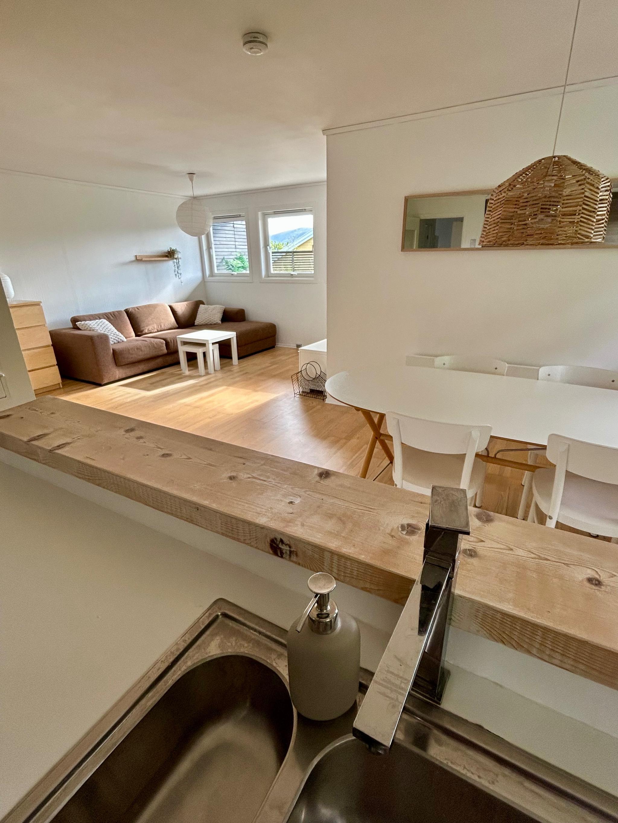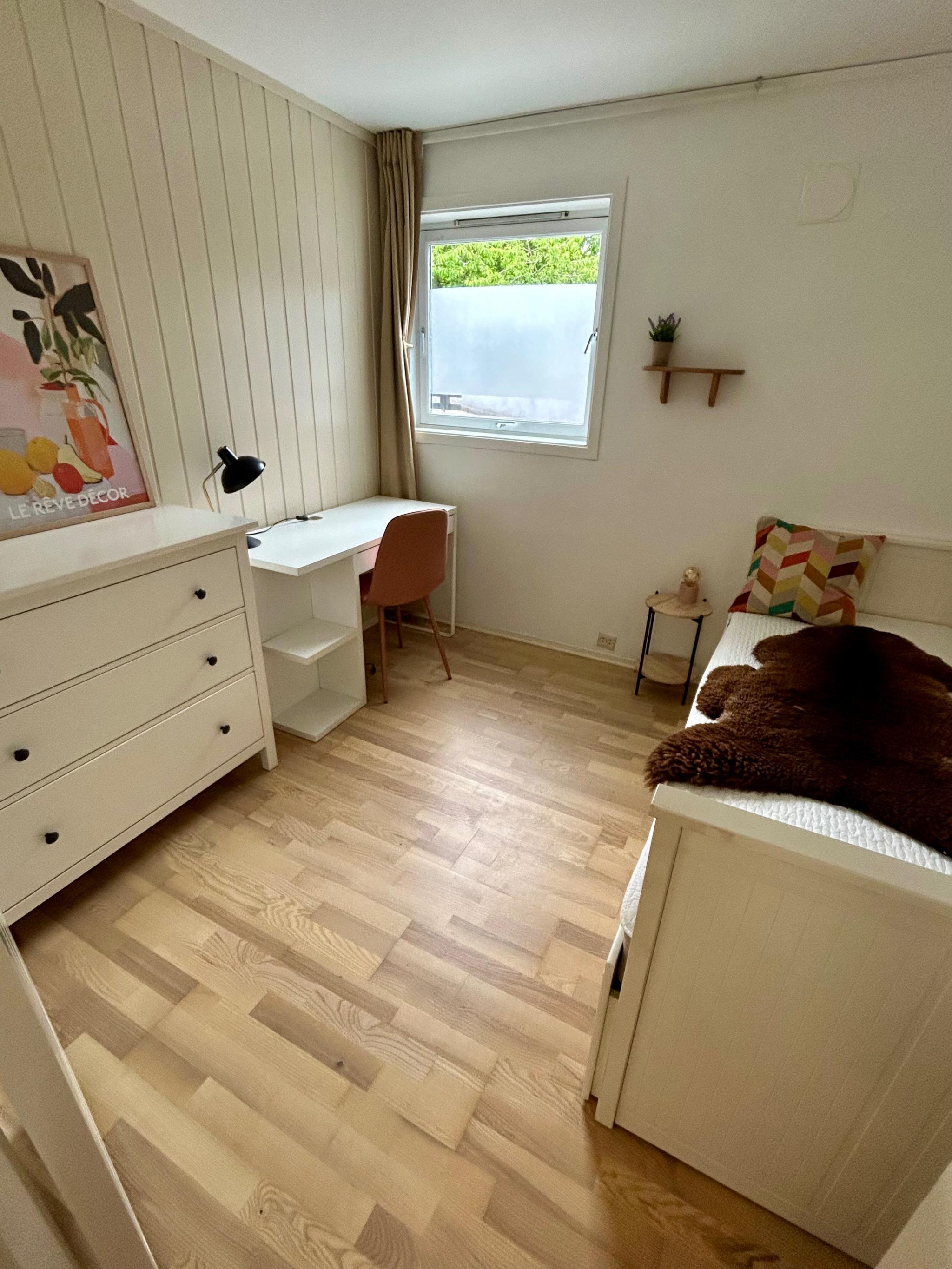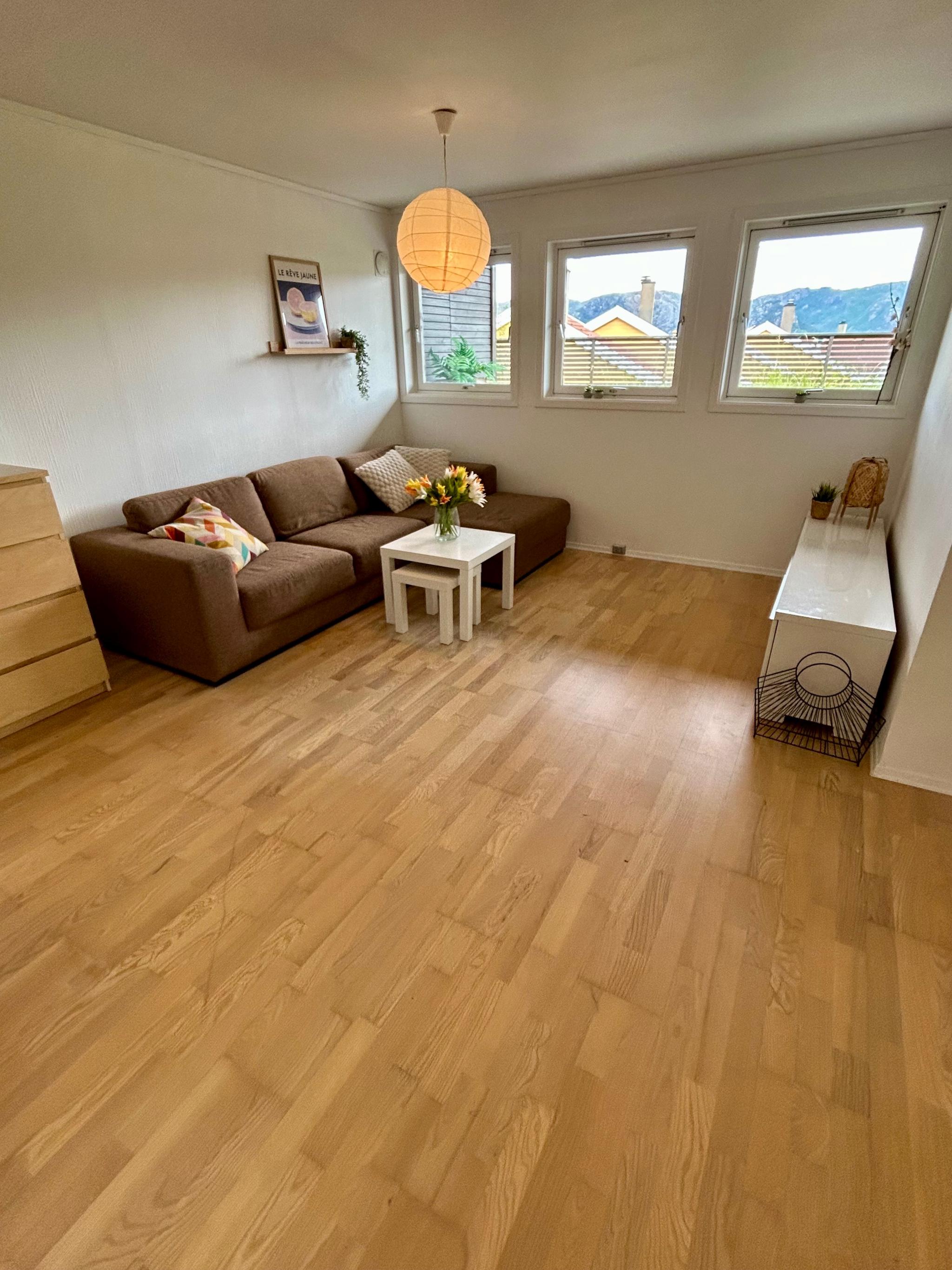 Vi leier ut en lys og moderne leilighet med høy takhøyde på 64 kvm med 2 soverom fra 01.07.2025, perfekt for to venninner som ønsker en hyggelig plass å bo.