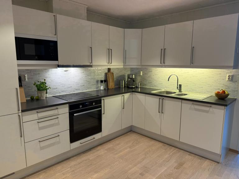 • Leies ut umøblert. Integrerte hvitevarer som stekeovn, induksjonsplate, mikrobølgeovn og kjøleskap følger med.