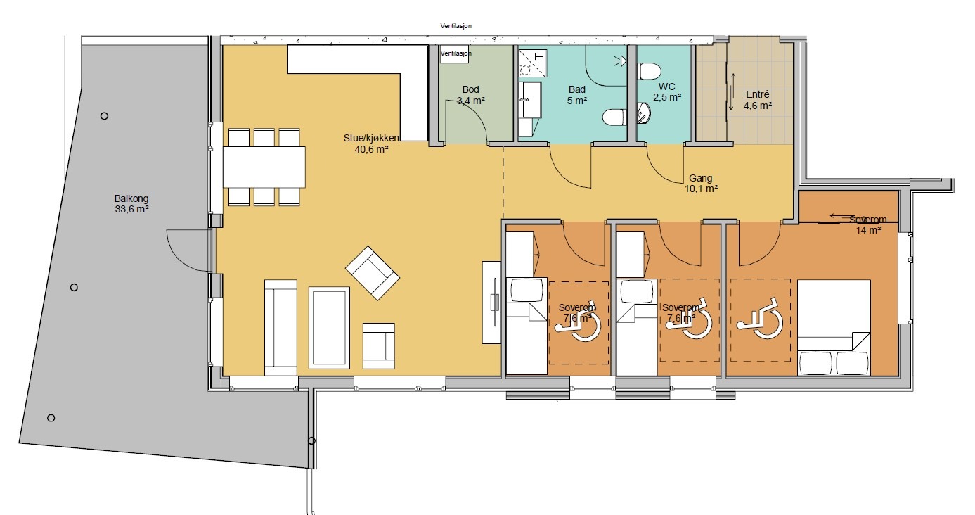 Gang / entré. 3 soverom. WC. Bad. Bod. Kjøkken. Stue.