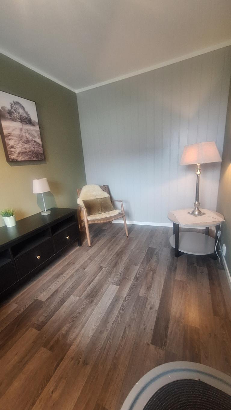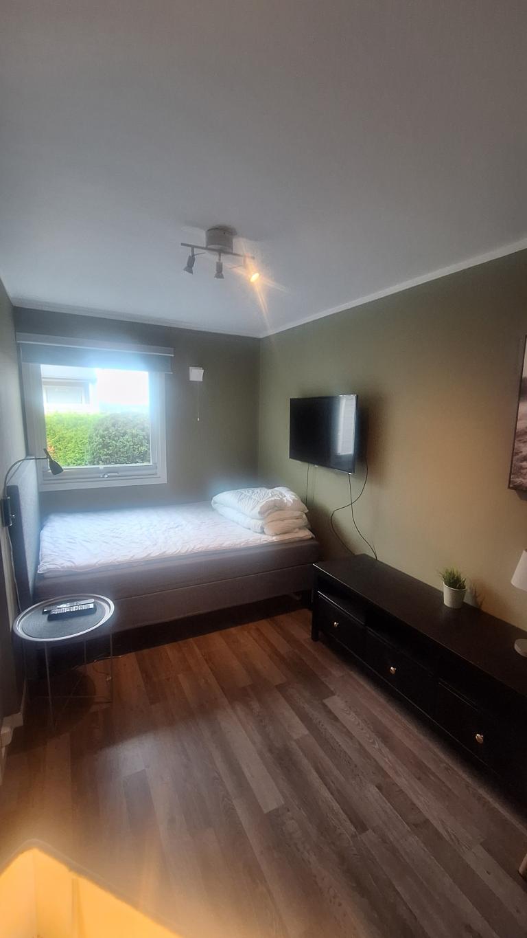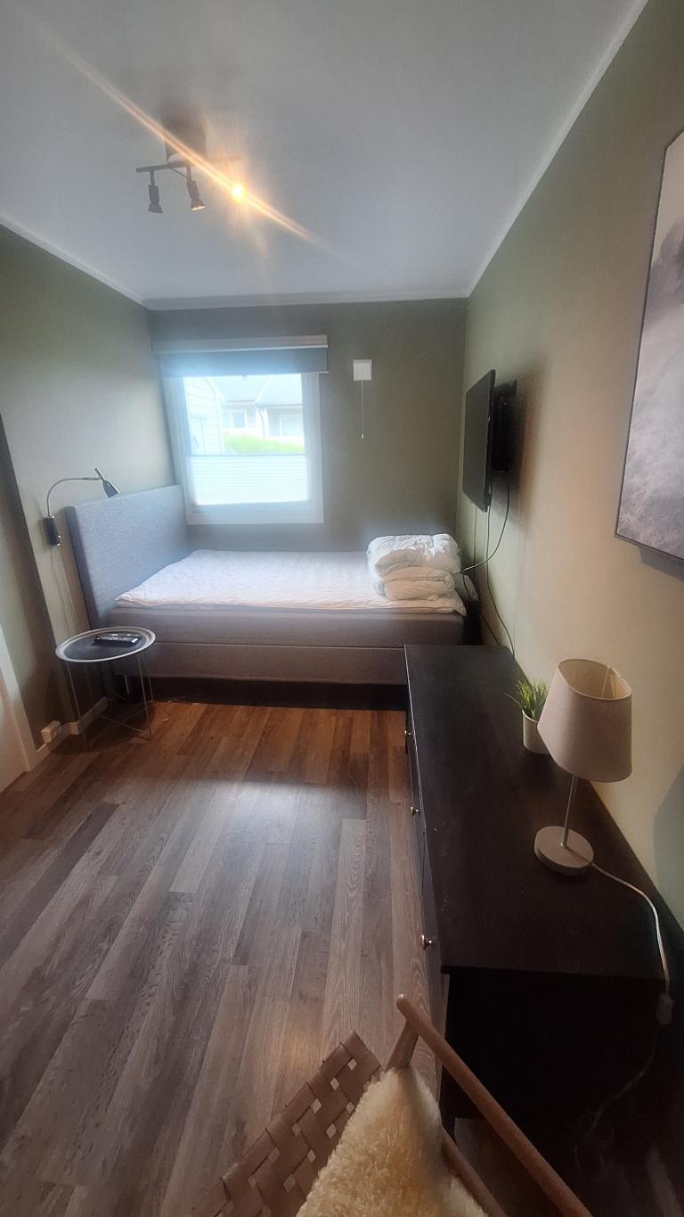 Delvis møblert; seng 1.40 bred, to høye stoler og bord på tekjøkken. (div kjøkkenutsyr og sengetøy hvis ønskelig).