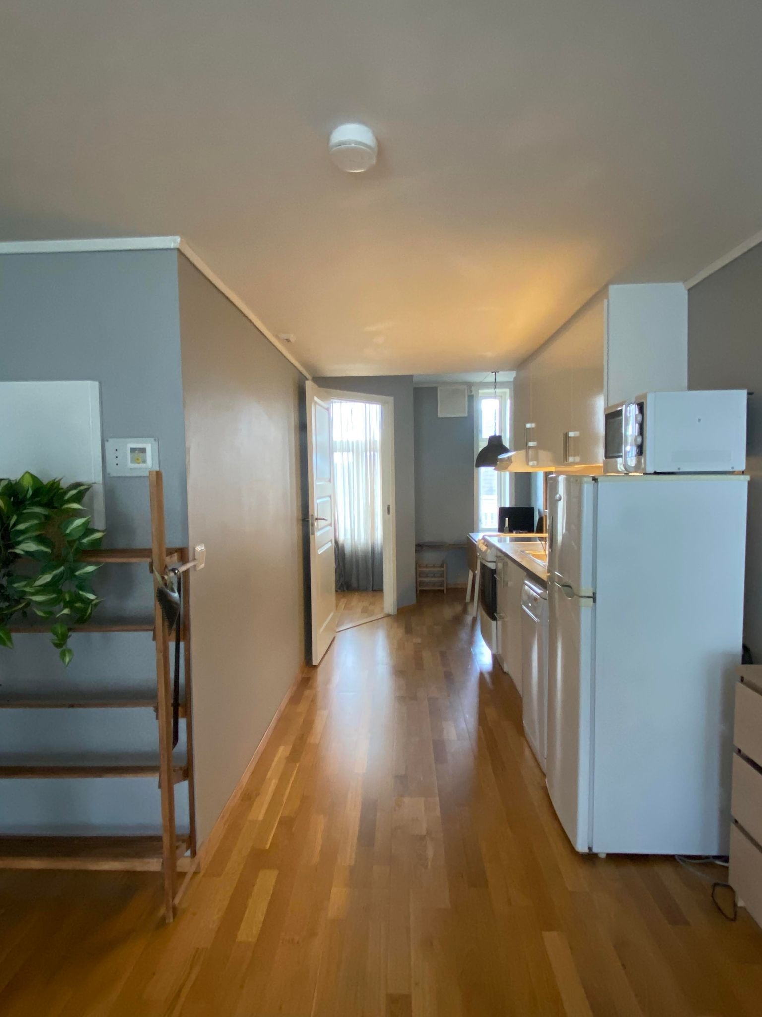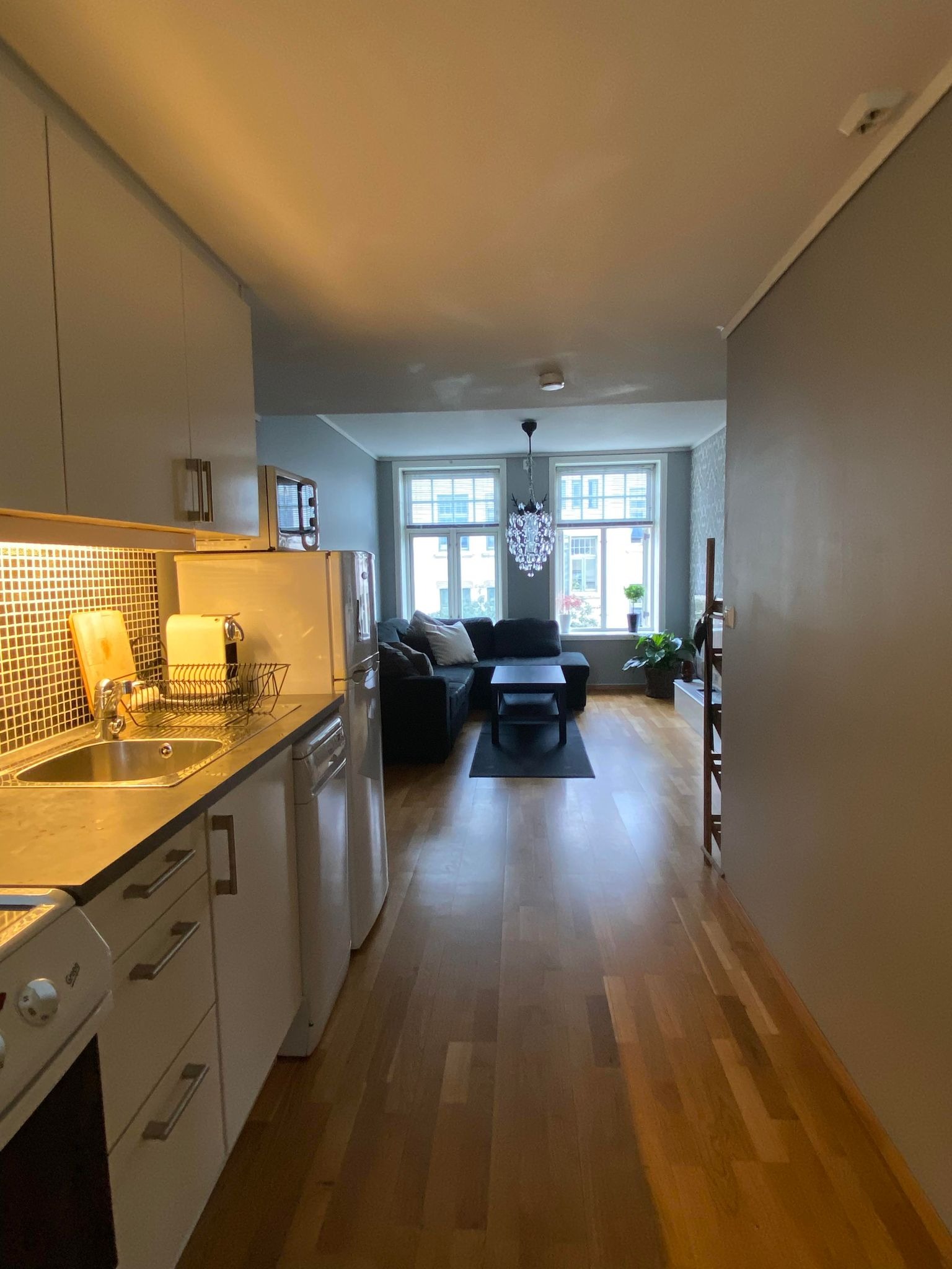 Indre rom: Kjøkken, bad, soverom, kjøkken & stue.
