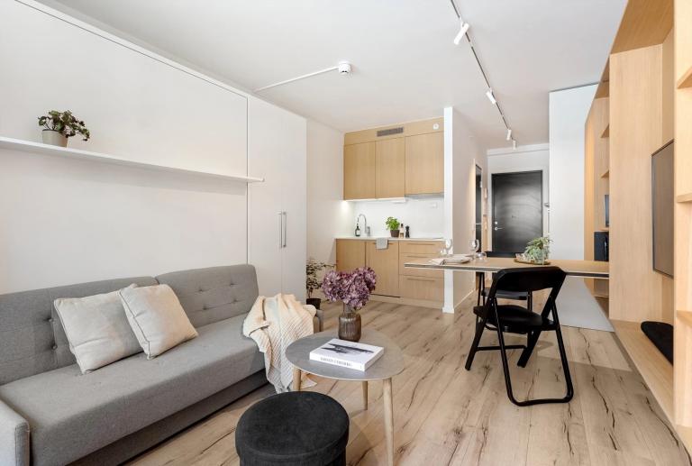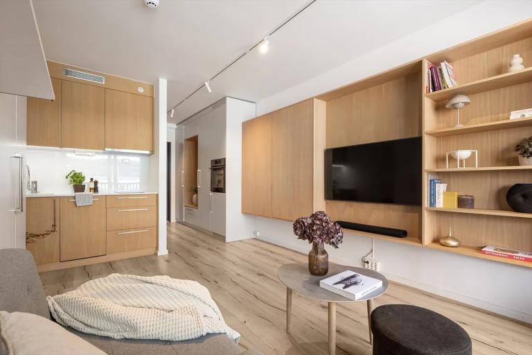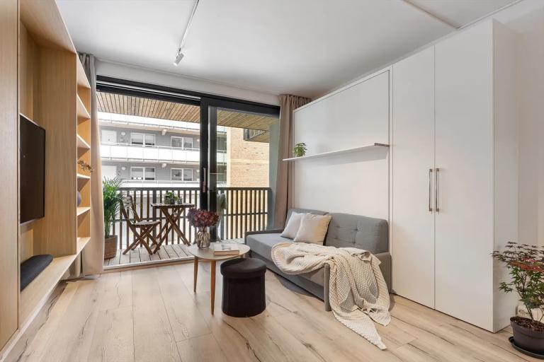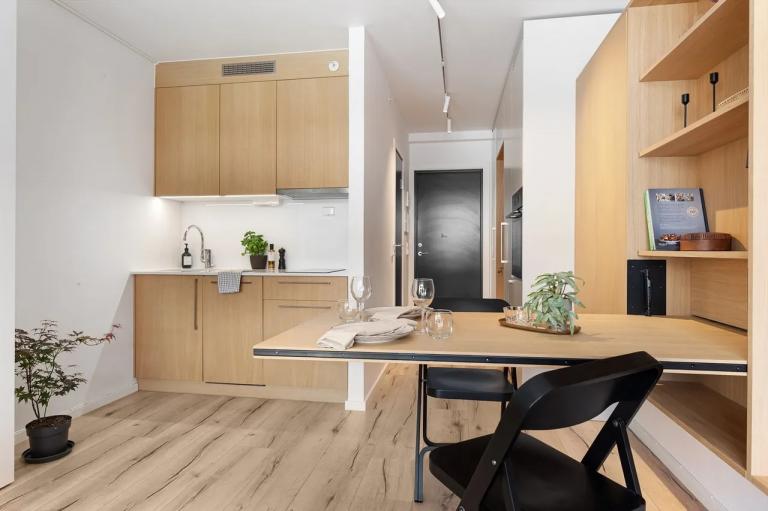 Flott studio leilighet på 25 kvm på Bankveien 10B i Asker sentrum leies ut fra 22.09.2025. Boligen er møblert. Leiligheten har en smart løsning hvor spisebord, stoler, sofa og seng er vegg montert og kan derfor legges vekk for mer plass.