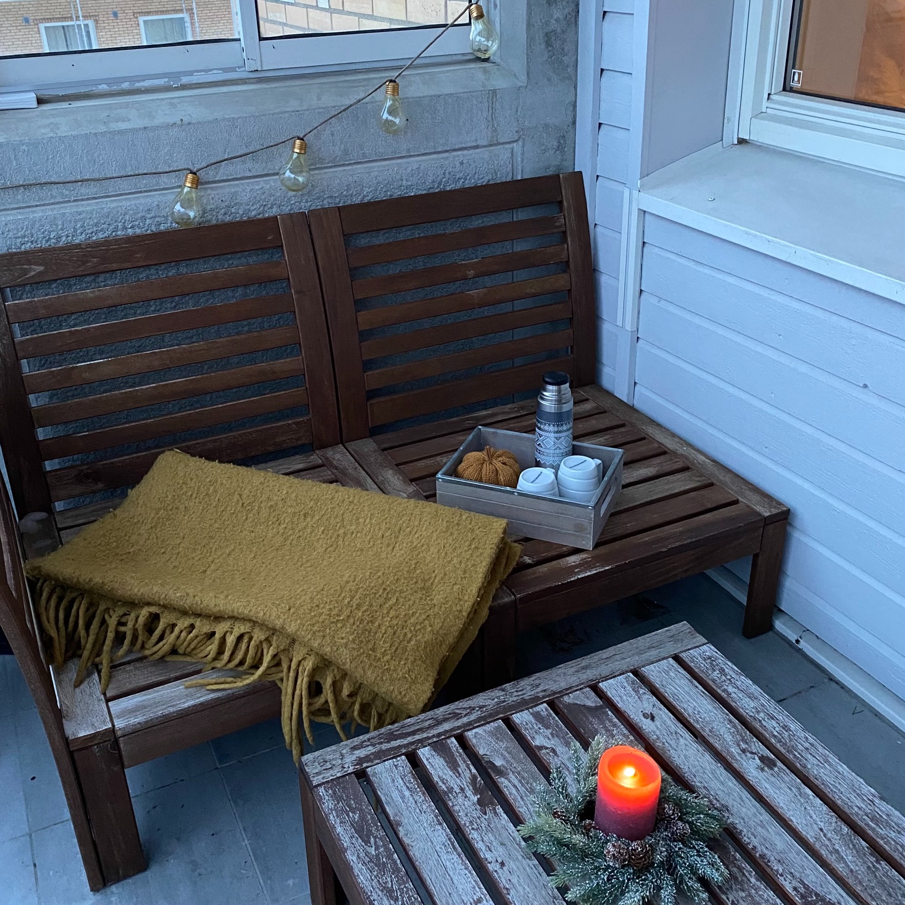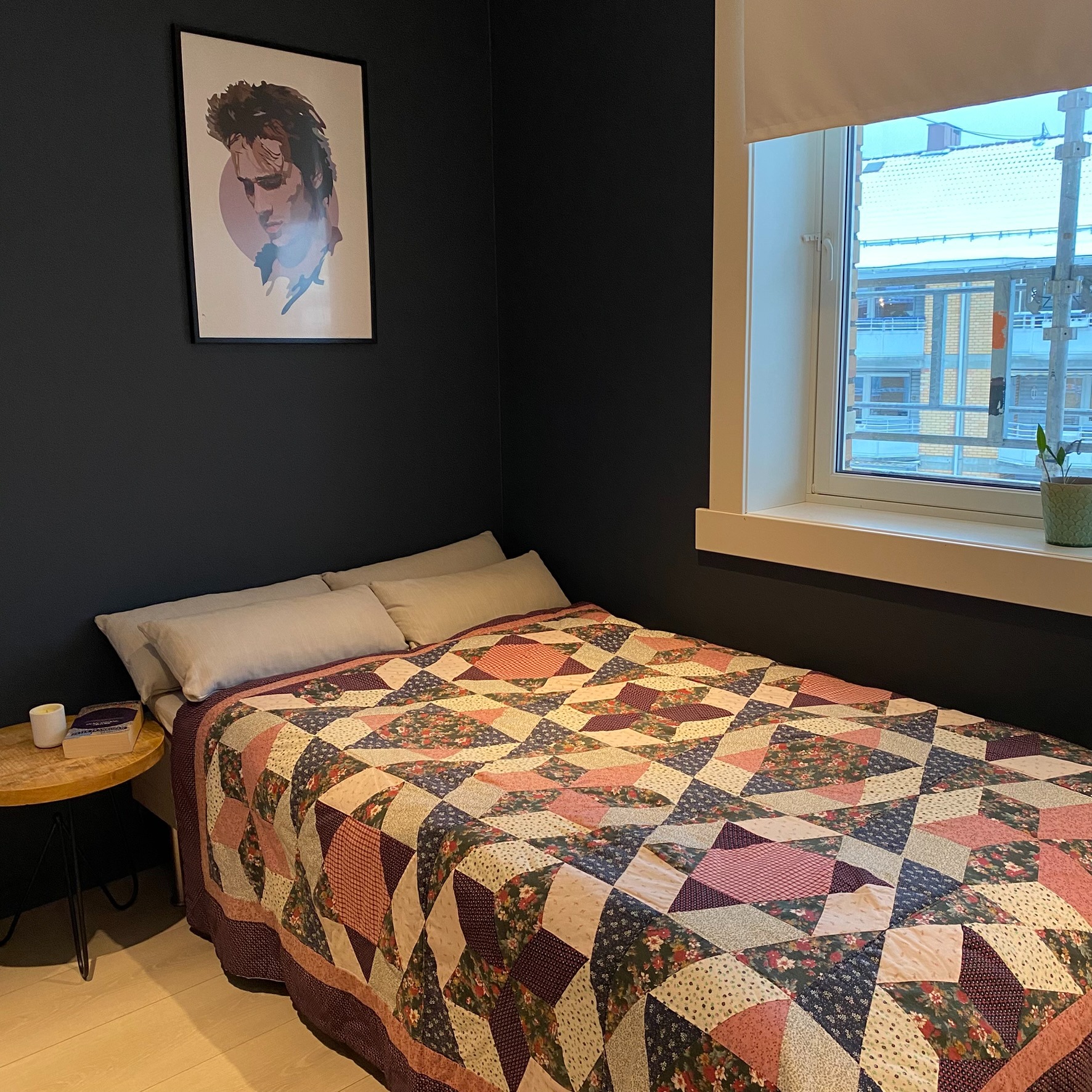 Stillas utenfor bygningen tas ned om noen uker (rehabilitering av skorsteiner i regi av borettslag som vil være ferdig når leieperioden starter).