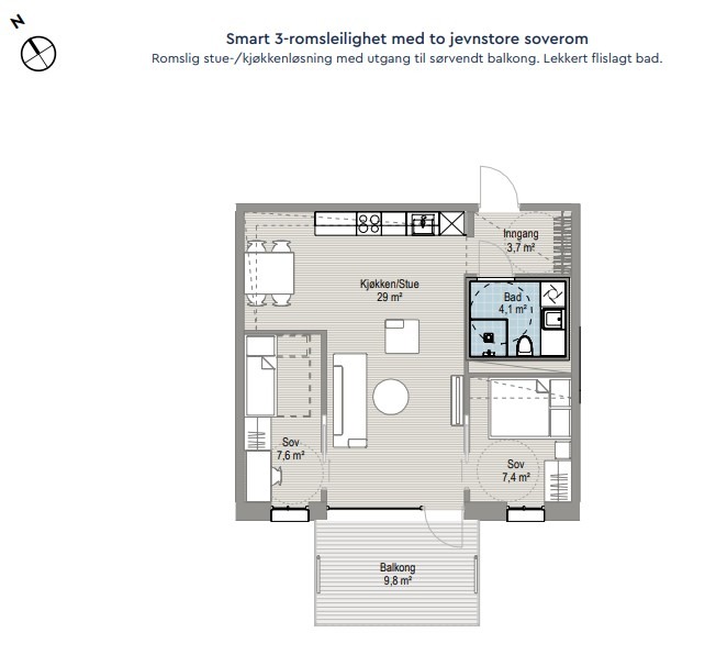 Leiligheten har en smart planløsning, og består av romslig stue/kjøkken, to gode soverom og et lekkert bad. Leiligheten har også en solrik balkong på ca. 10 kvm. Bod i kjeller.