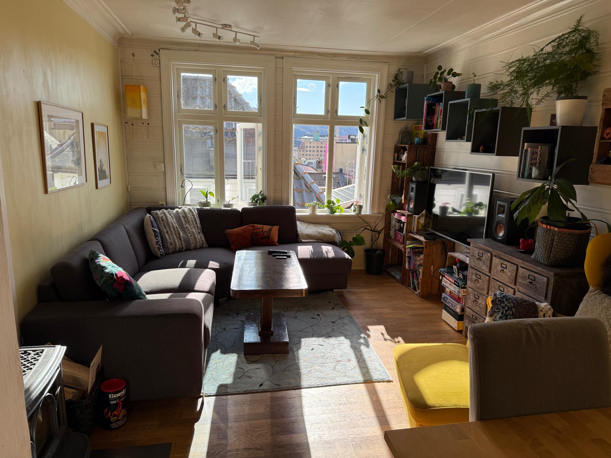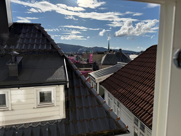 Det er en veldig liten og koselig leilighet på solsiden, og helt sentralt i byen med flott utsikt. Her er gangavstand til alt, 2 min til Fløyen, fisketorget eller Bryggen. Du har utsikt utover hustakene i byen og kveldssol som skinner inn på både soverom og stue.