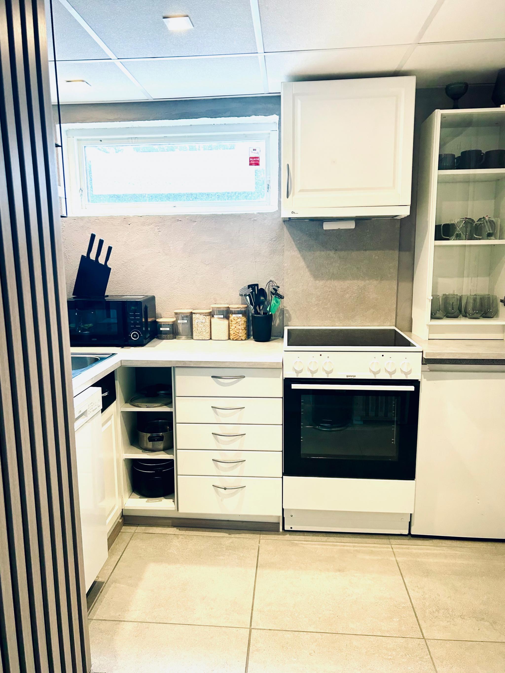 delvis møblert; alt av hvitevarer, og stor fin sofa med sjeselong og bord. Alt av kjøkkenutstyr .