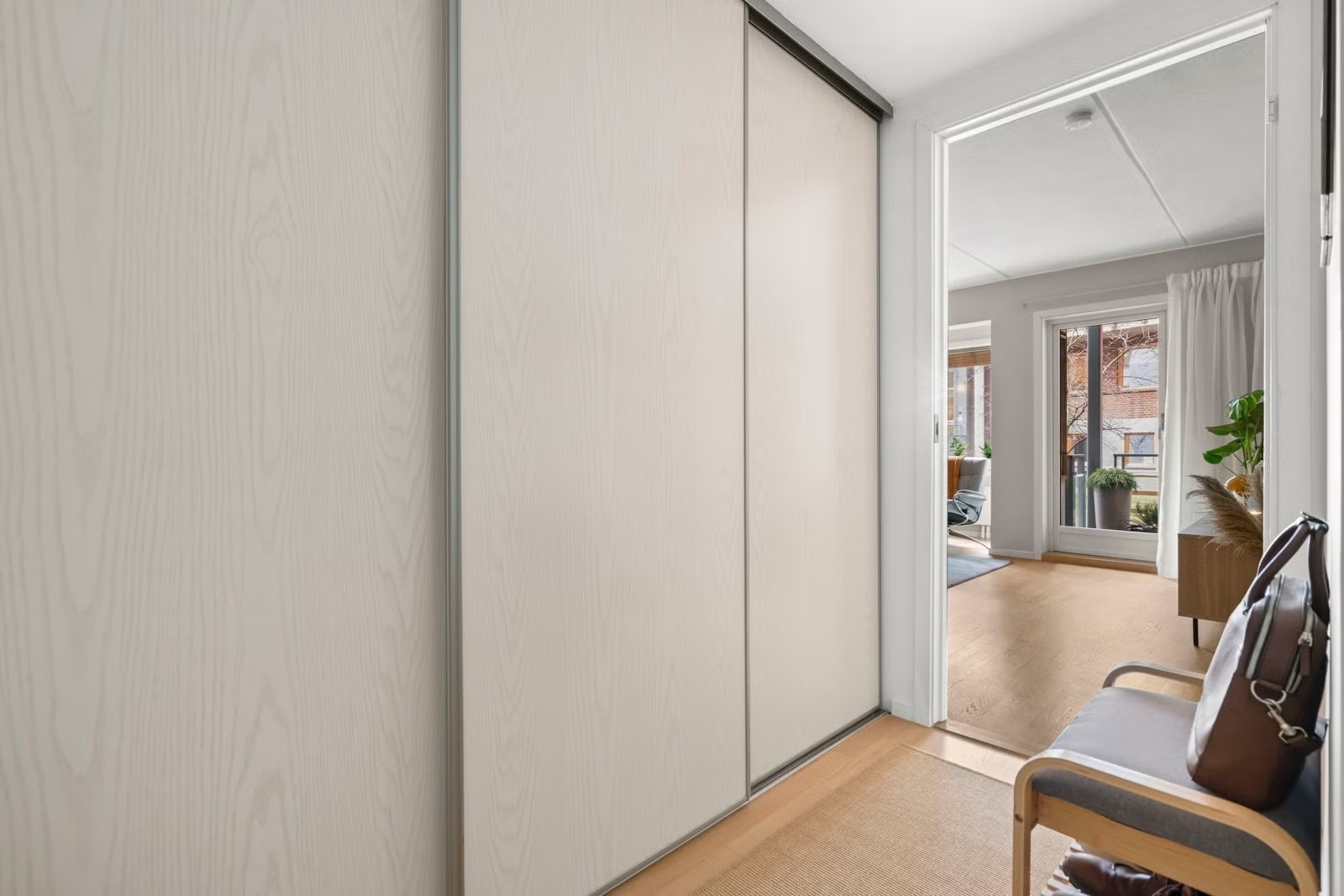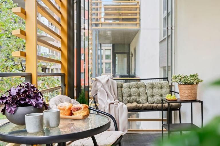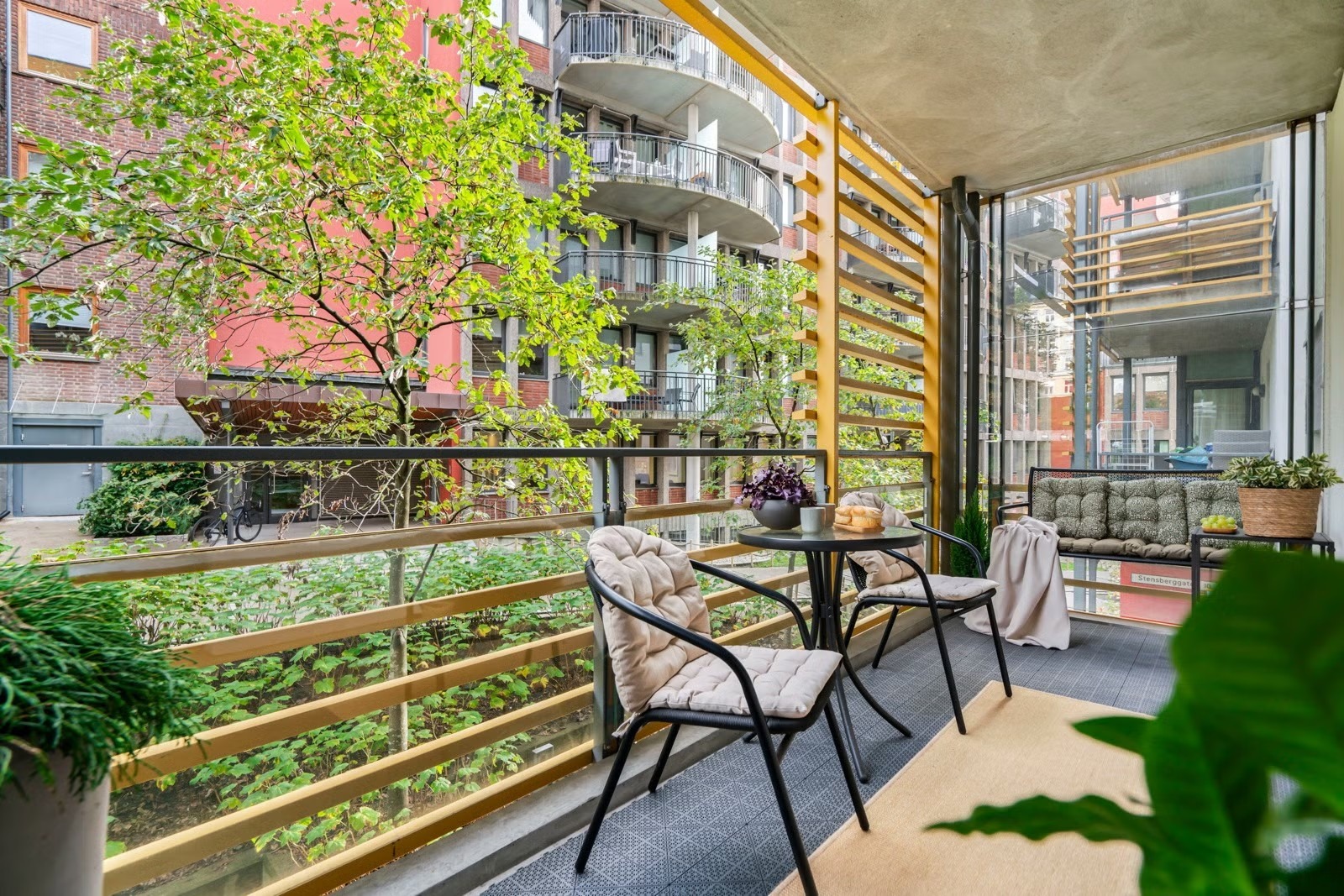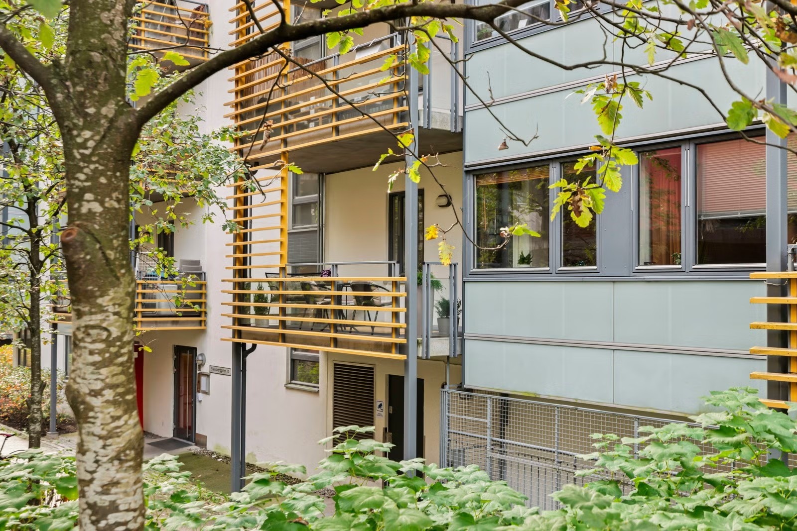 Leiligheten oppleves som luftig og har en god planløsning. Fra stuen er det utgang til en romslig balkong vendt mot indre intern gangvei i grønne og bilfrie omgivelser. På sommerstid er fellesområdene omgitt av en grønn oase med vakre busker og velstelte parkområder. Beboerne disponerer en felles takterrasse med gode solforhold.