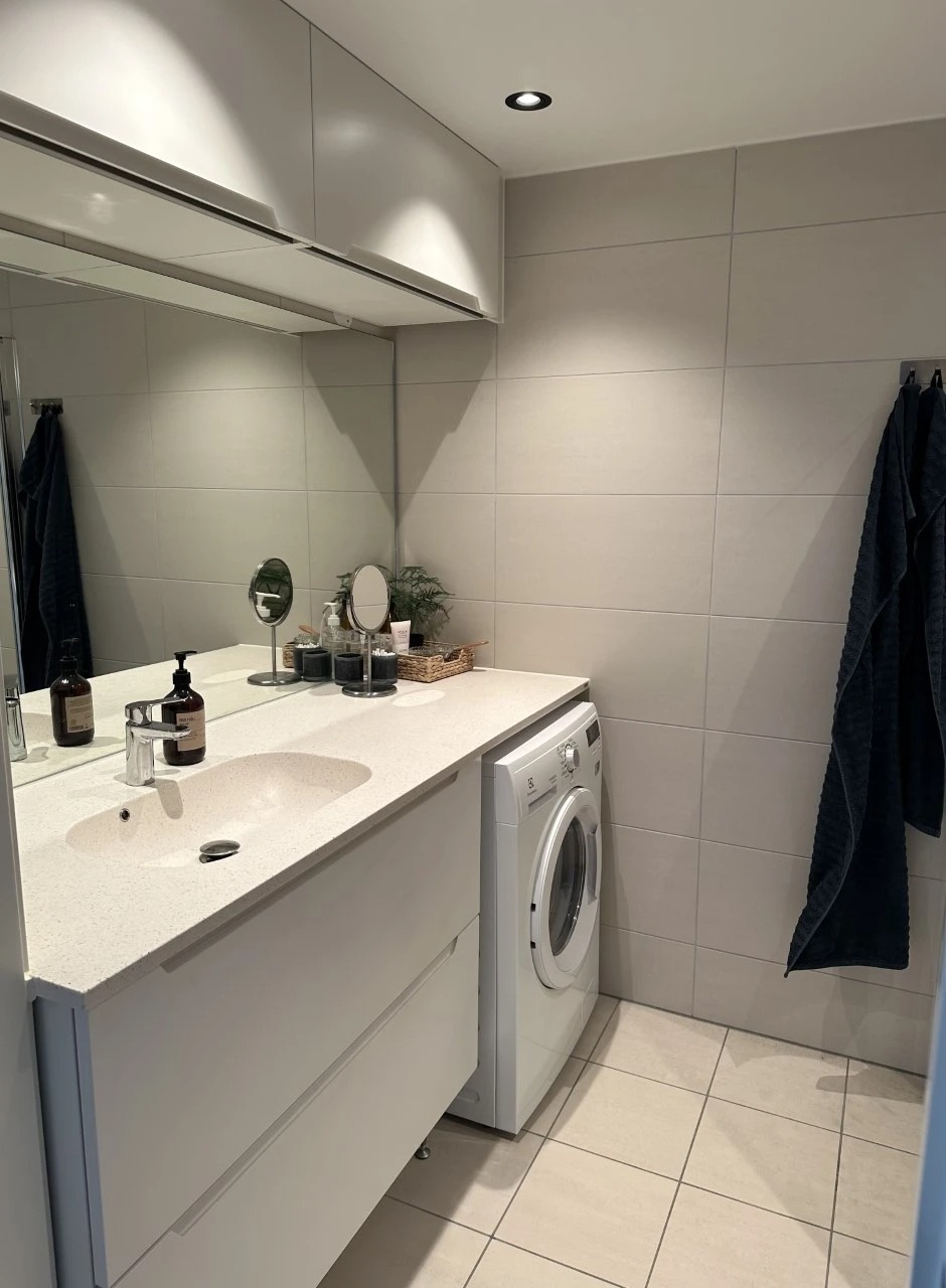 - Tilvalg på baderomsfliser, dusjhjørne med glassdører, speil med oppbevaringsskap under og over servant.