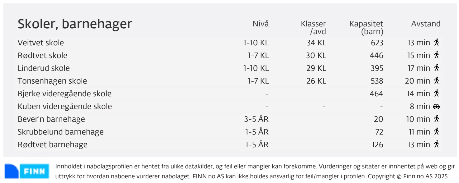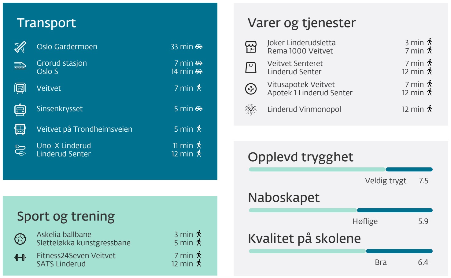 Boligområde med kort gangavstand til T-bane (Veitvet), matbutikker, Linderud og Veitvet senter, barnehager og skoler. Lillomarka og Veitvetparken ligger like ved, med turmuligheter, lekeplasser og fritidstilbud. Se vedlagte bilder som viser avstand til treningssenter, kollektiv og servicetilbud.