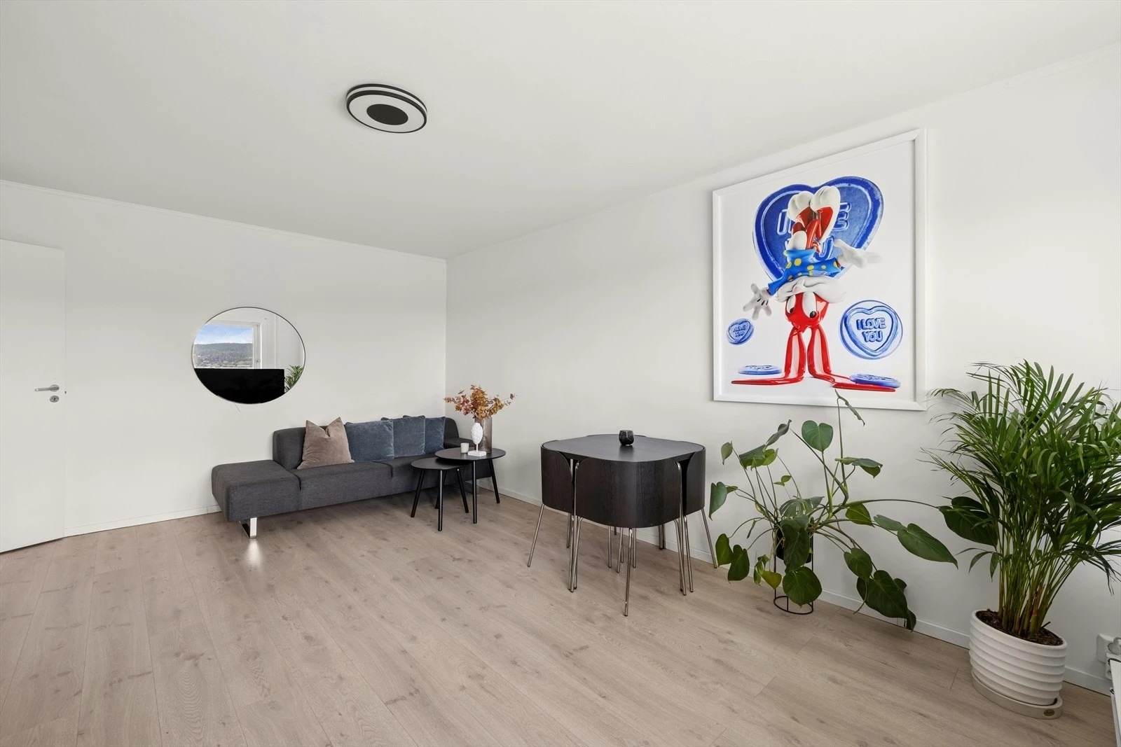 Stue/kjøkken: Sofa, spisebord med stoler, salongbord, tv-bord