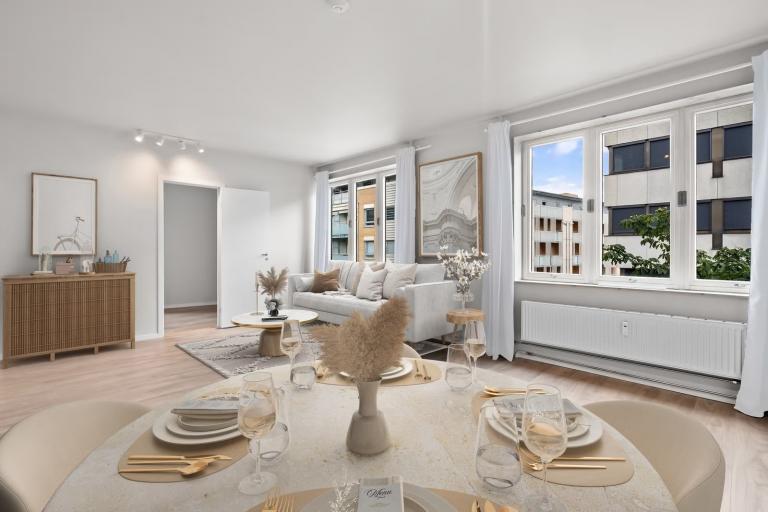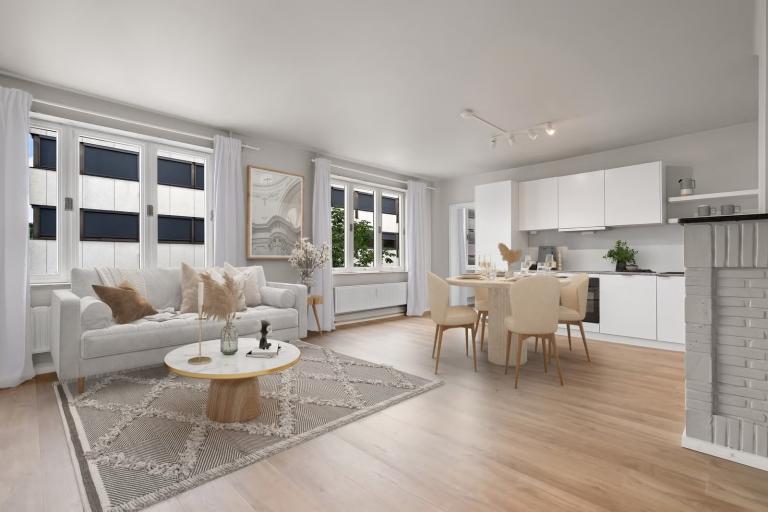 Det er rom for en spisestue mellom sonene og store vindusflater sørger for rikelig med naturlig lys. Videre har leiligheten et delikat baderom og tre store soverom.
