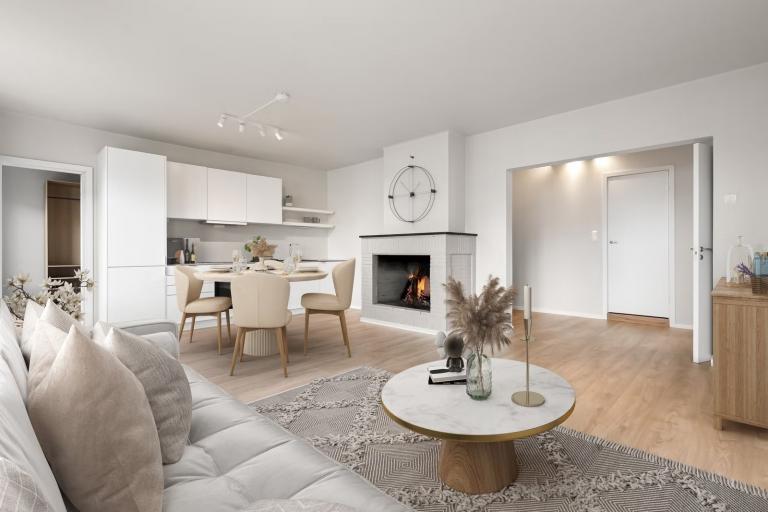 Boligen ble pusset opp i 2022 og holder en gjennomgående høy standard. Den er malt i lyse tidsriktige farger og har en luftig og areal-effektiv planløsning.
