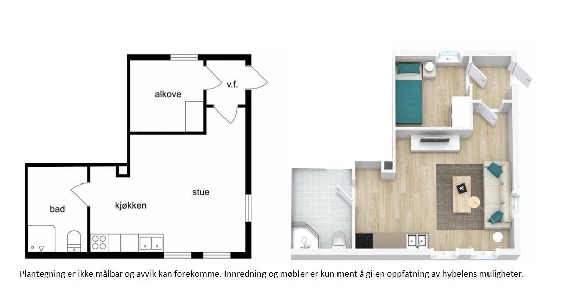 Hybelen inneholder stue med kjøkken, bad, gang og sovealkove. Egen inngang. Passer for enslige eller par uten barn.