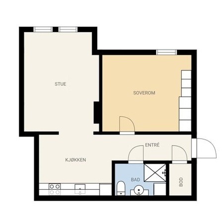 Her får du et koselig oppholdsrom med stue og kjøkken, bad med dusjnisje og varmekabler, en innvendig bod, og et romslig soverom med god plass til garderobe.