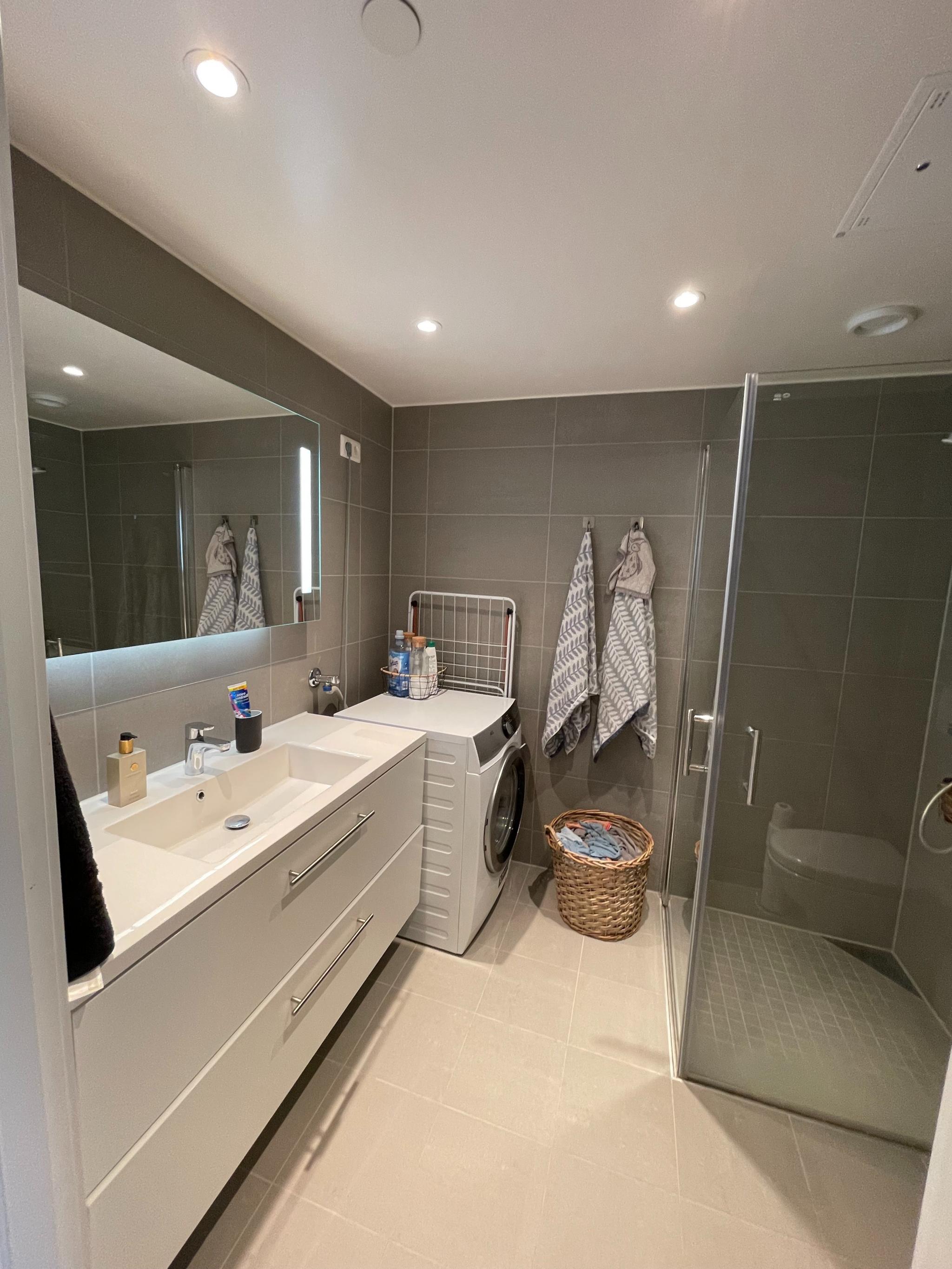 Denne lekre nye 2-roms leiligheten på 45kvm er av gjennomgående høy standard og er godt vedlikeholdt. Vi overtok leiligheten i 2019. Leiligheten består av entre, soverom, bad og stue med pent åpen kjøkkenløsning. Boligen inneholder praktisk innvendig bod.