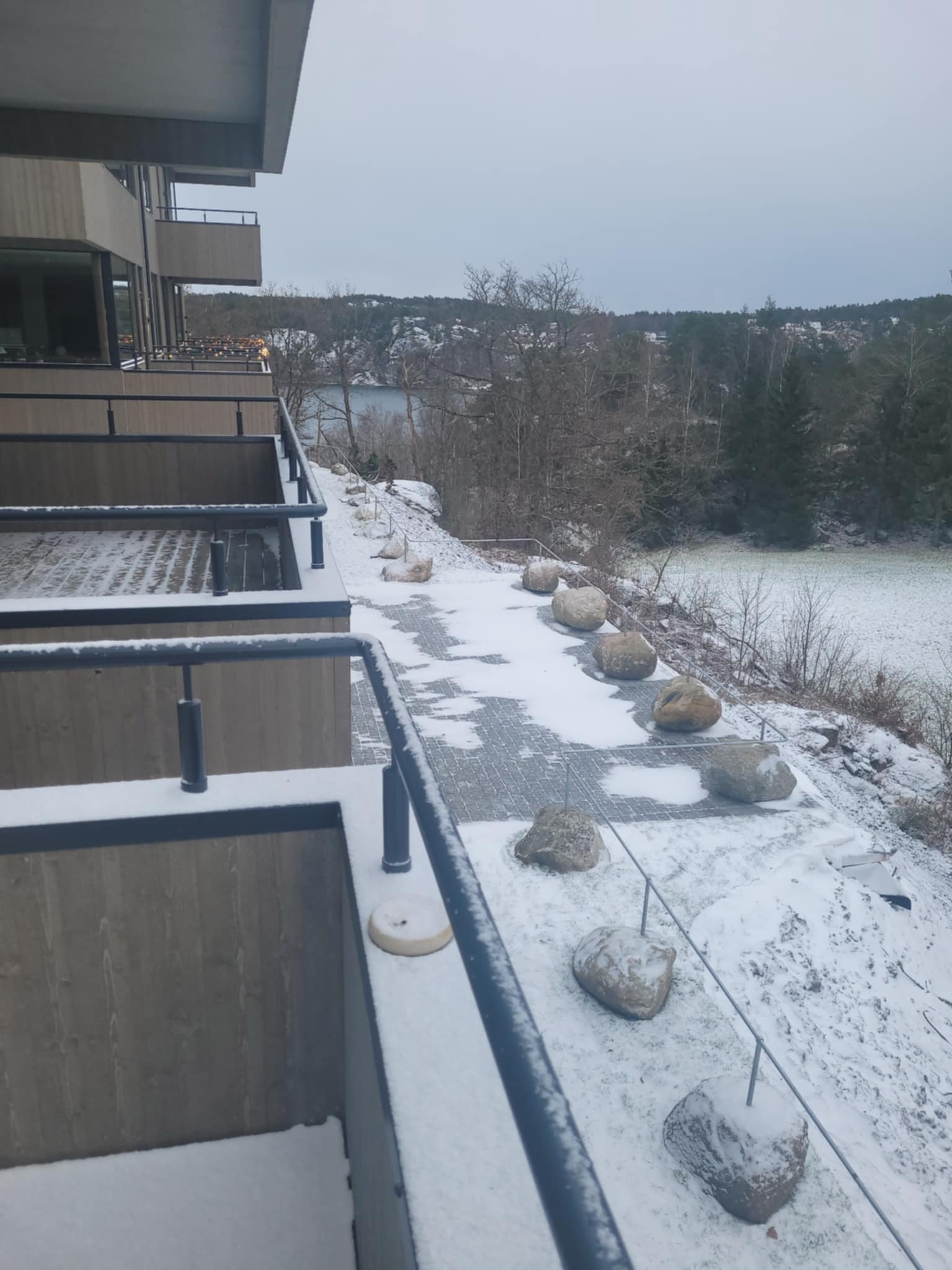 Fra stuen har du et stort vindu som gir direkte tilgang til en solrik terrasse med utsikt mot grøntarealer og et hint av sjøgløtt.