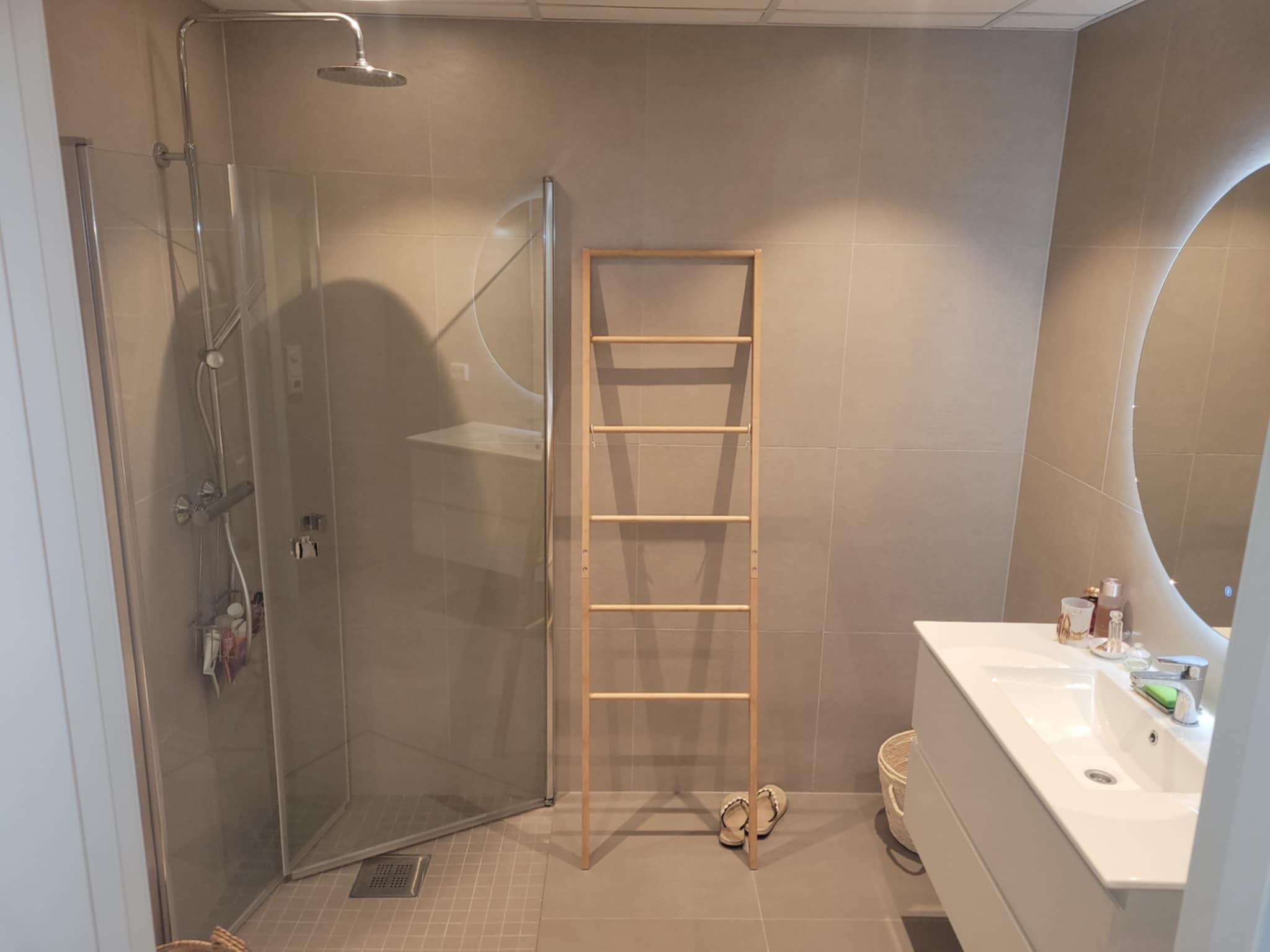 Leiligheten har et romslig og fresht bad komplett med fliser både på gulv og vegger, downlights i tak, veggmontert toalett, dusjvegger av laminert glass, takdusj og et elegant Nora 90 speil med LED-backlight for den perfekte finishen.