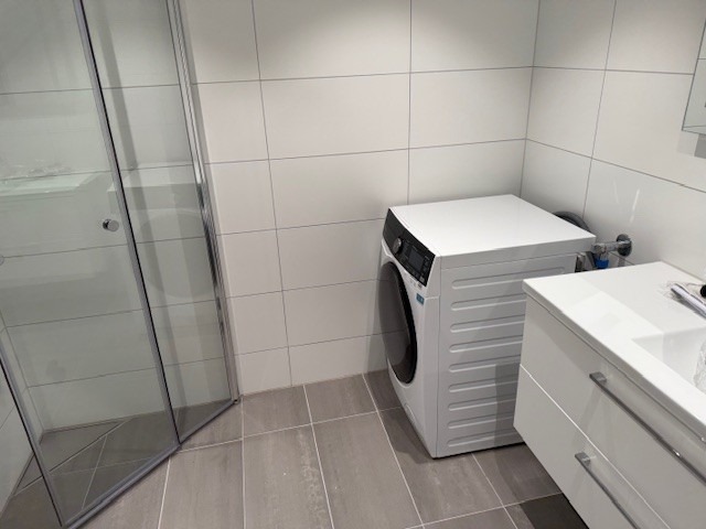 Badet fremstår moderne med stilrene fliser og god romfølelse.