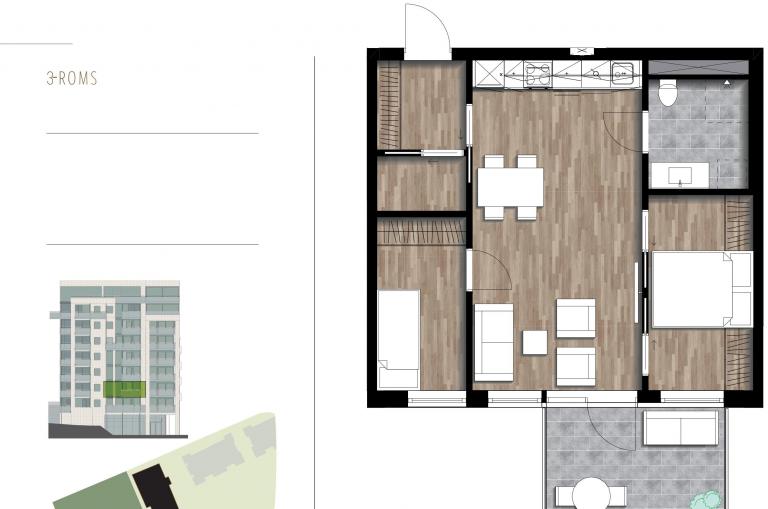 Stuen er lys og romslig, med store vindusflater og skyvedør ut til en romslig balkong. Balkongen vender mot den nye parken på Øvre Nyhavna og gir en rolig og luftig atmosfære.