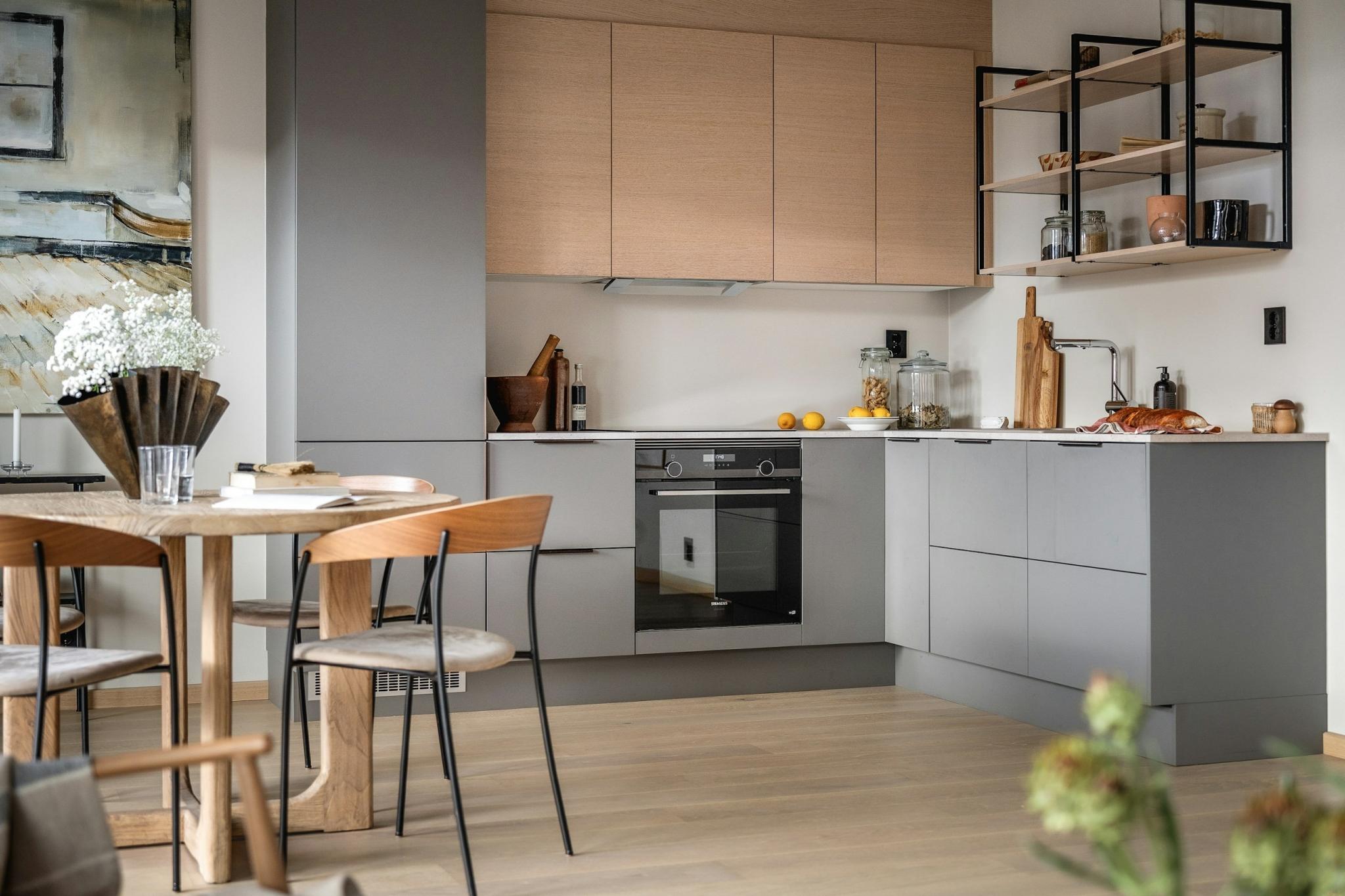 Stor hjørnestue med åpen kjøkkenløsning fra HTH og utgang til balkong ca. 13,2 m²