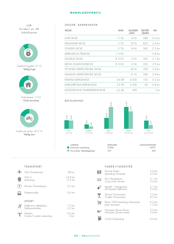 Pallplassen ligger på toppen av Lørenskog Stasjonsby og gir deg nærhet til naturen samtidig som du har enkel tilgang til både Oslo og Lillestrøm. Området har mange fine turmuligheter og du kan ta på deg turskoene eller skiene hjemme og gå rett ut i skogen. Rundt husene blir det dessuten store uteområder der man kan nyte den naturlige vegetasjonen i området. Det er også kort avstand til Lørenskog stasjon som har hyppige avganger til alle deler av Lørenskog og videre ut i regionen.