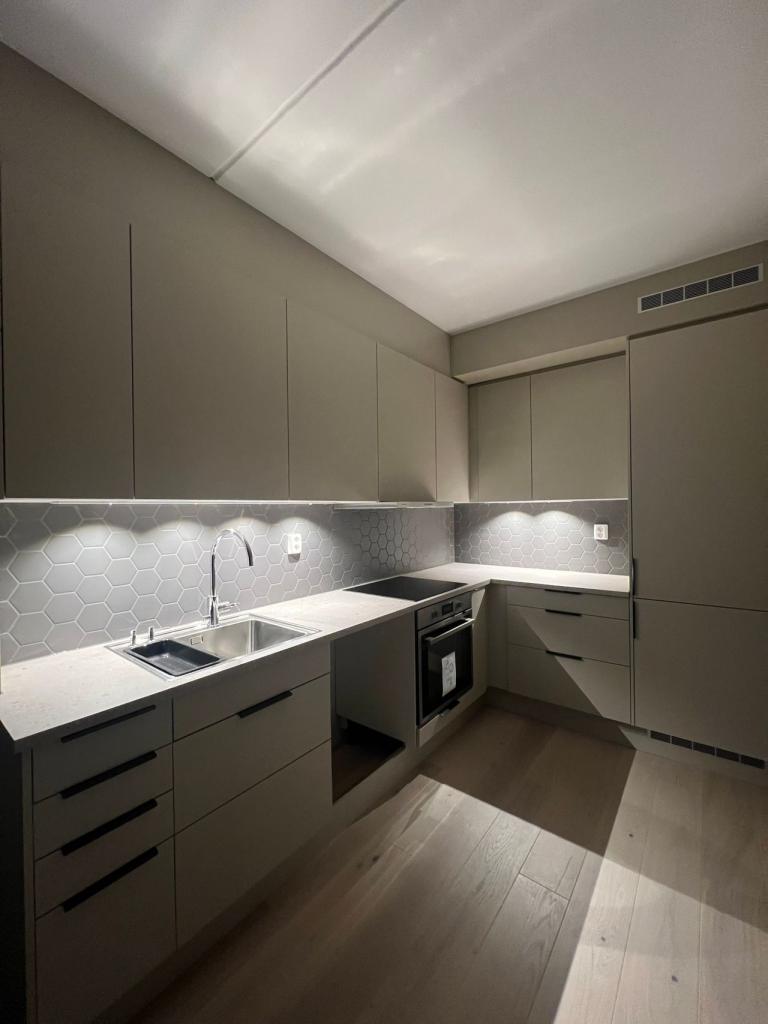 Leiligheten har en åpen planløsning mellom stue og kjøkken, med moderne og funksjonelle kjøkkenløsninger. Leiligheten har et stilrent bad fliser på veggene.
