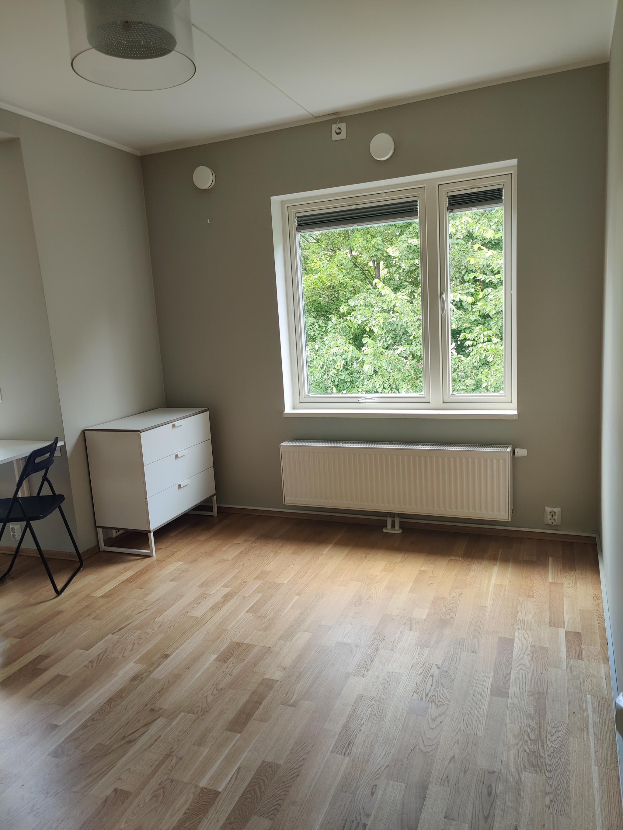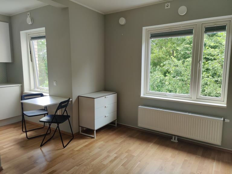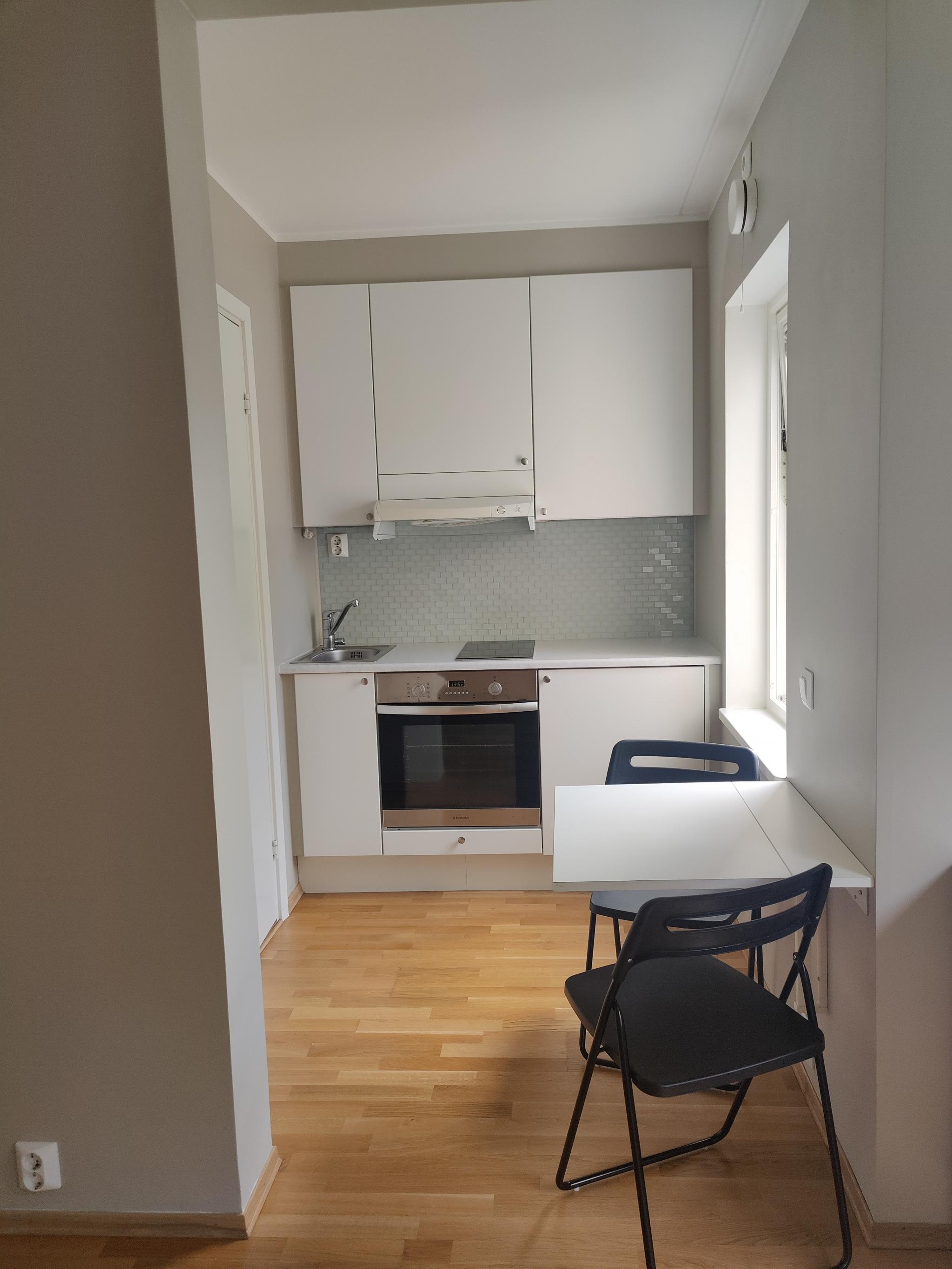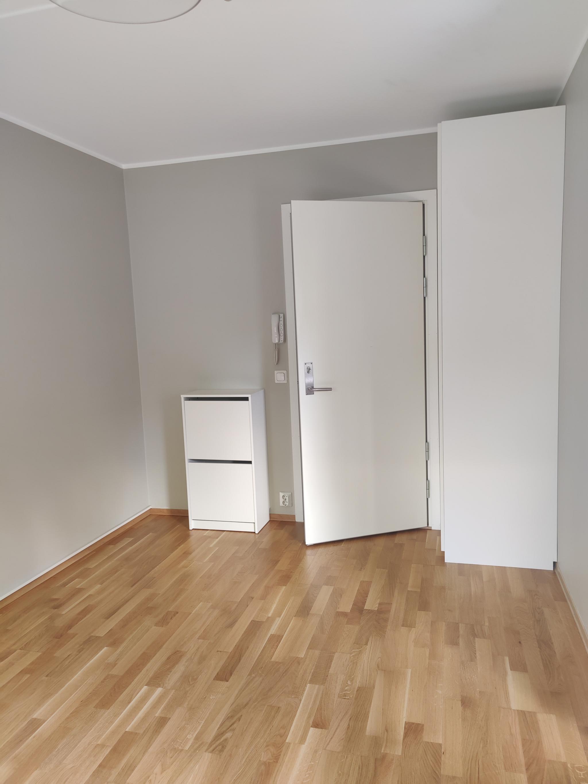 Lysegrå vegger og parkett på gulv. Ett garderobeskap og en kommode. Skoskap i felles entré. Kjøkken med skapplass, induksjonstopp, stekeovn og kjøleskap. Det er kjøkkenbord med sitteplass til to personer.