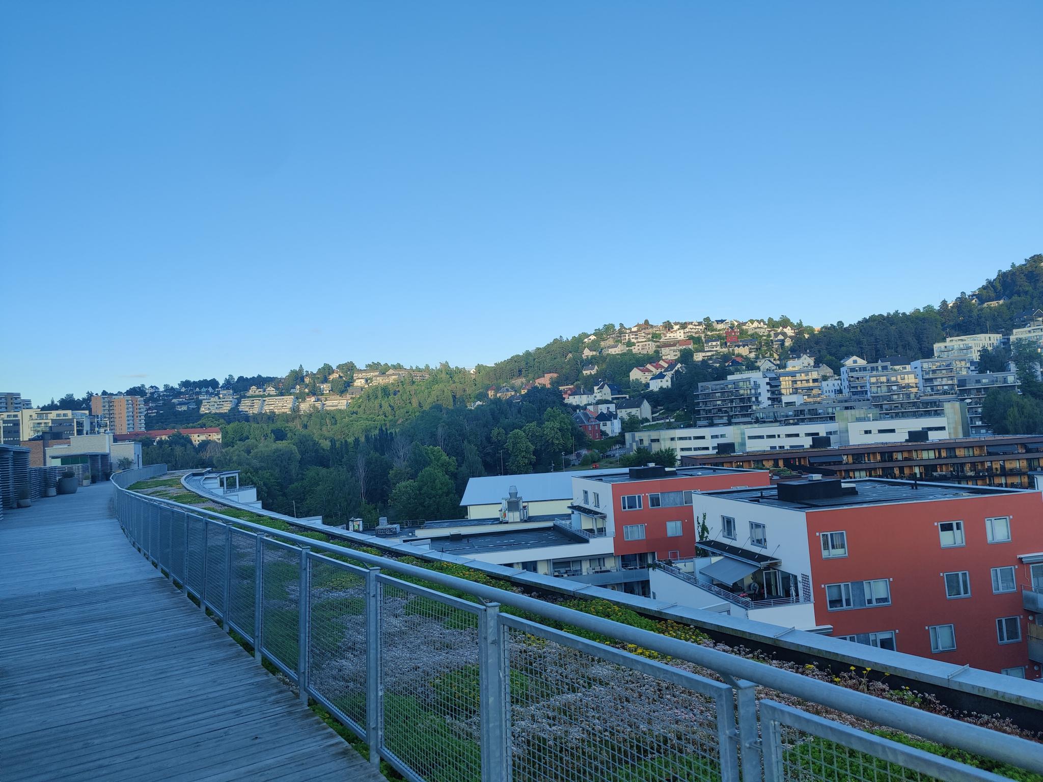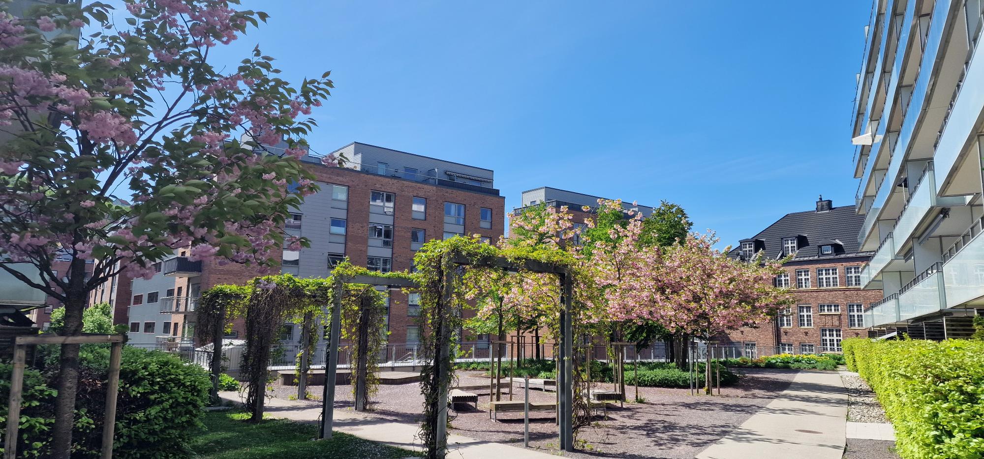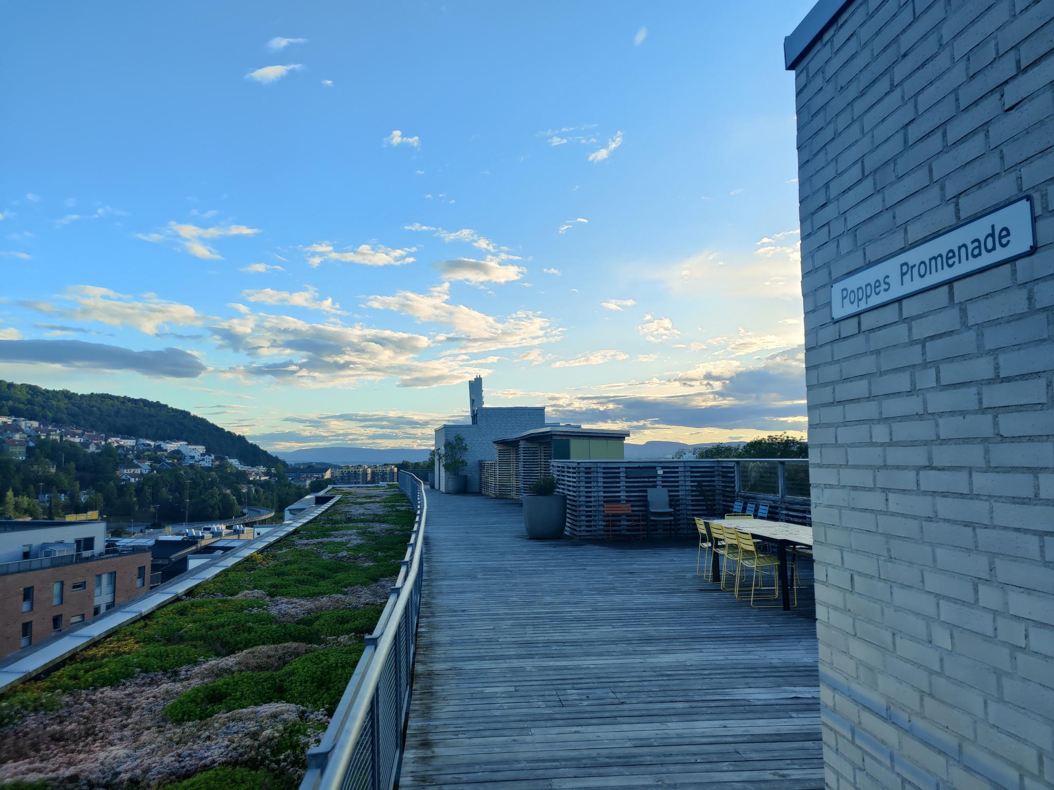 Området utenfor er pent beplantet og rolig. Det er også en stor takterrasse med utsikt over Ekeberg og Bjørvika man kan benytte.