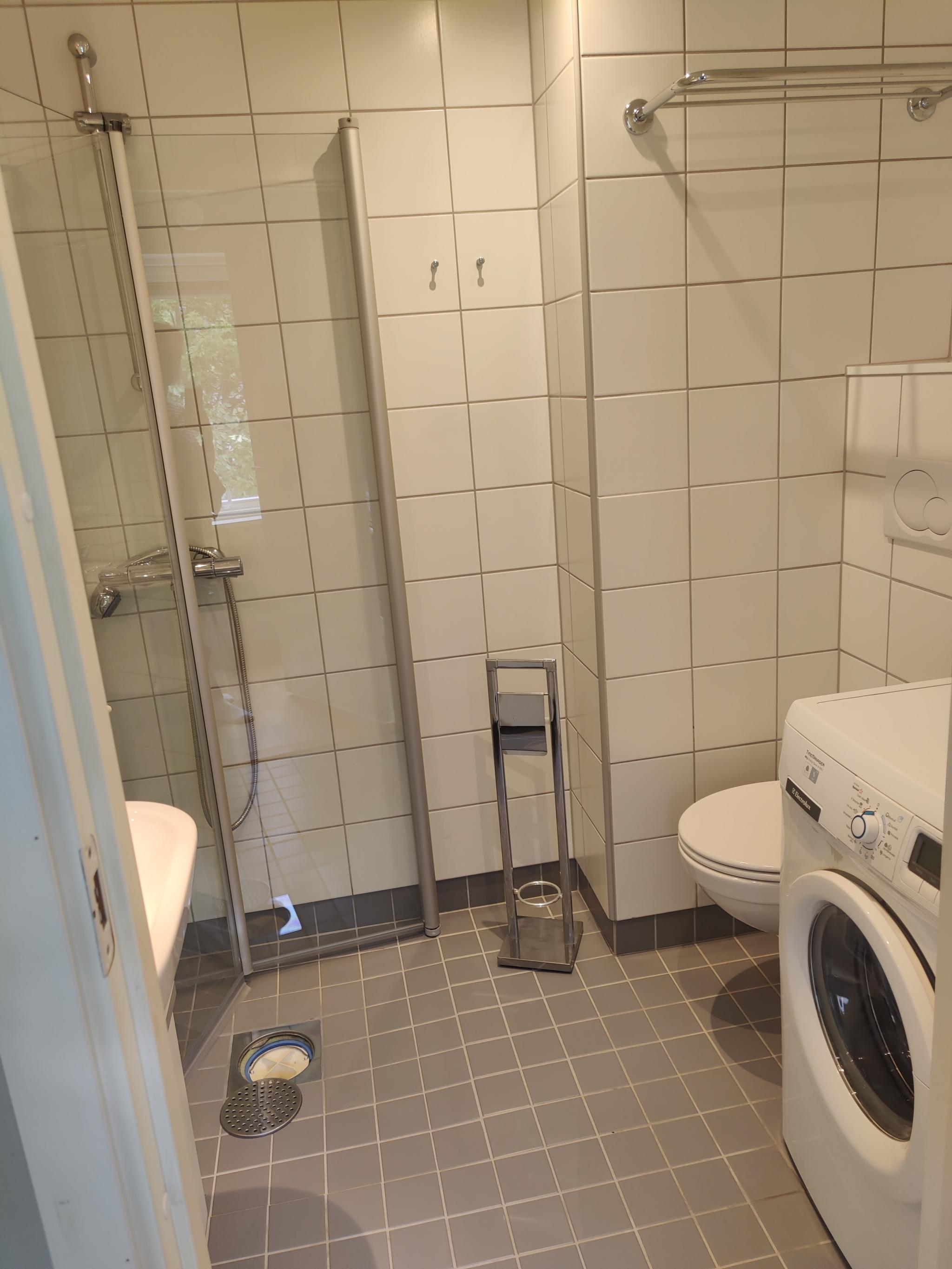 Delikat flislagt bad med gulvvarme og vaskemaskin.