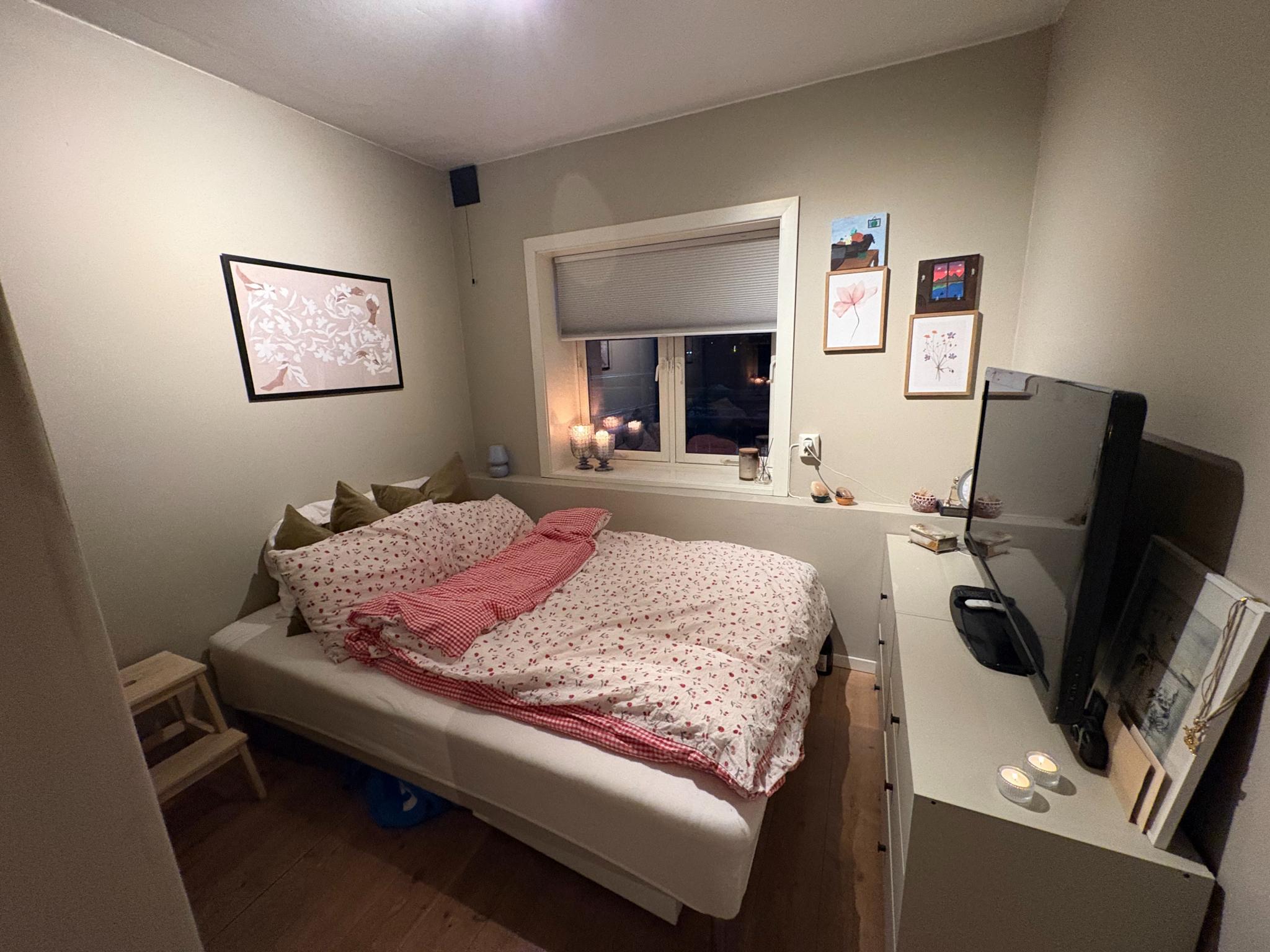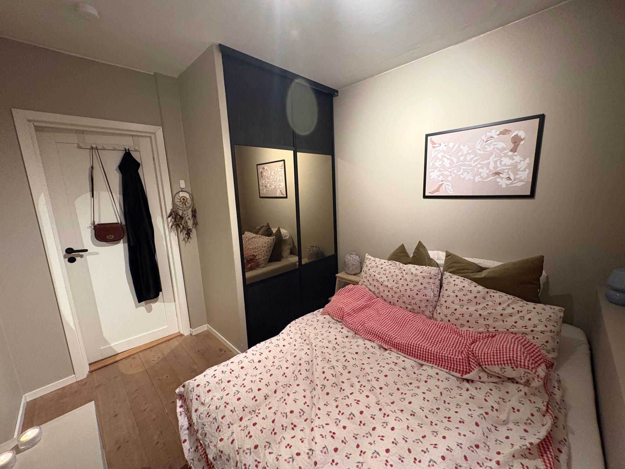 Rommet som leies ut er ca. 8 kvm og leies ut med garderobeskap og seng om ønskelig. Leiligheten har felles stue, kjøkken og bad, og gjesteparkering rett utenfor døra.