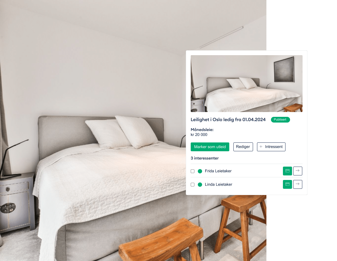 Når annonsen er publisert, får du en enkel oversikt over alle som har vist interesse for utleieannonsen. Du kan også legge til interessenter manuelt i oversikten.