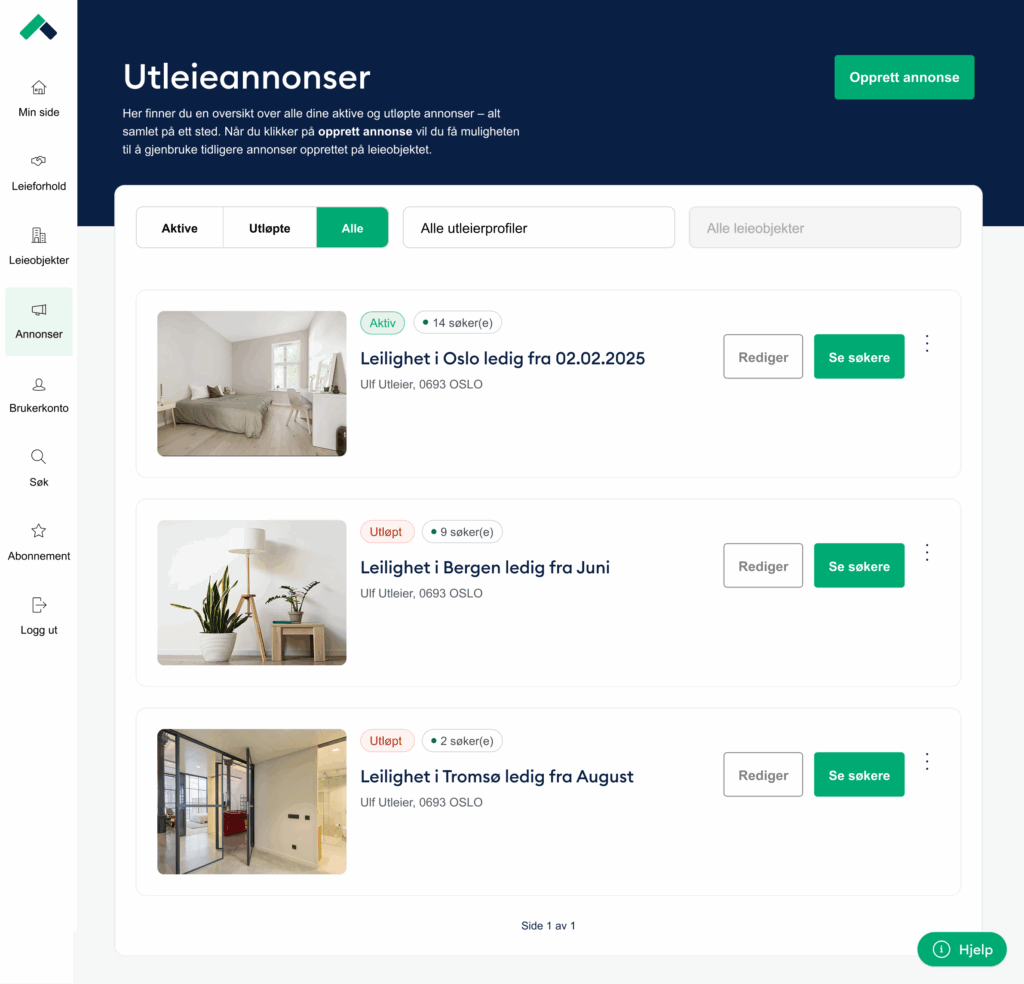 Hos Husleie.no har vi det siste året gjort flere viktige forbedringer i annonseverktøyet vårt. Med den innebygde interessehåndteringen får du enkelt oversikt over interesserte leietakere, kan sende invitasjoner til visning, gi avslag – og be om kredittsjekk, alt på ett sted.