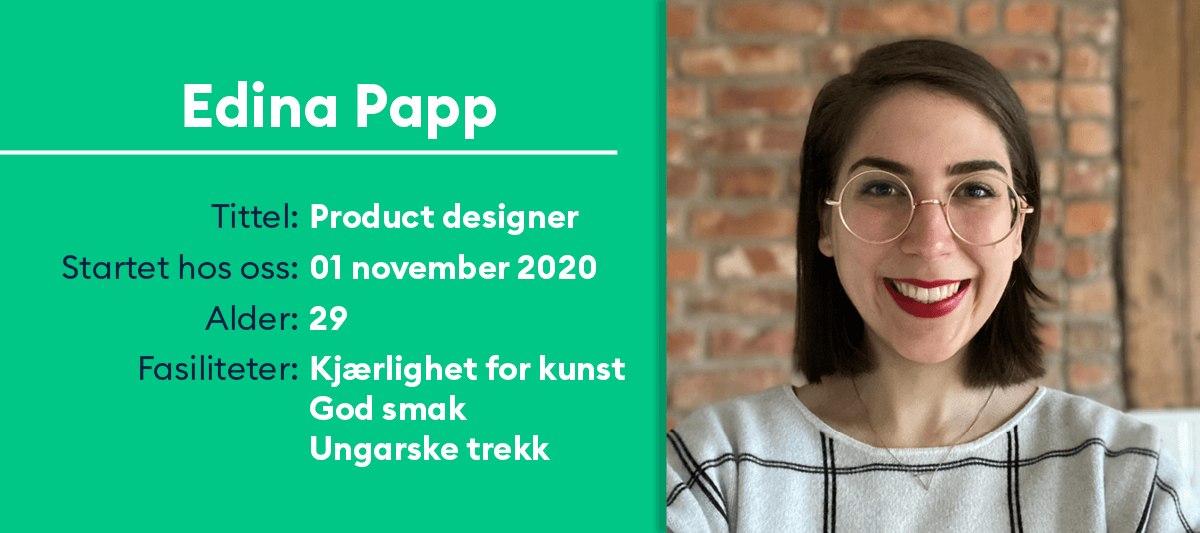 Edina begynte som Produktdesigner hos Husleie.no i november 2020, og har ansvaret for UX (User Experience) og UI (User Interface). Edina er den første produktdesigneren i produktteamet hos Husleie.no, og hun legger ikke skjul på at det er mange utfordringer i den nye rollen, men hun jobber hardt for å skape en god brukeropplevelse.