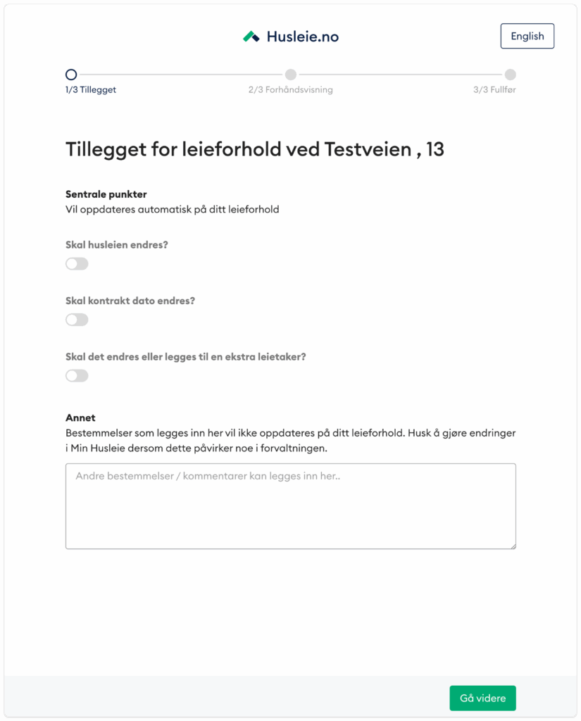 Dette er spesielt nyttig dersom leieforholdet skal forlenges eller endres etter at en tidsbestemt kontrakt har utløpt. I stedet for å lage en helt ny kontrakt, kan du nå bruke en tilleggskontrakt for å formalisere det dere har blitt enige om.